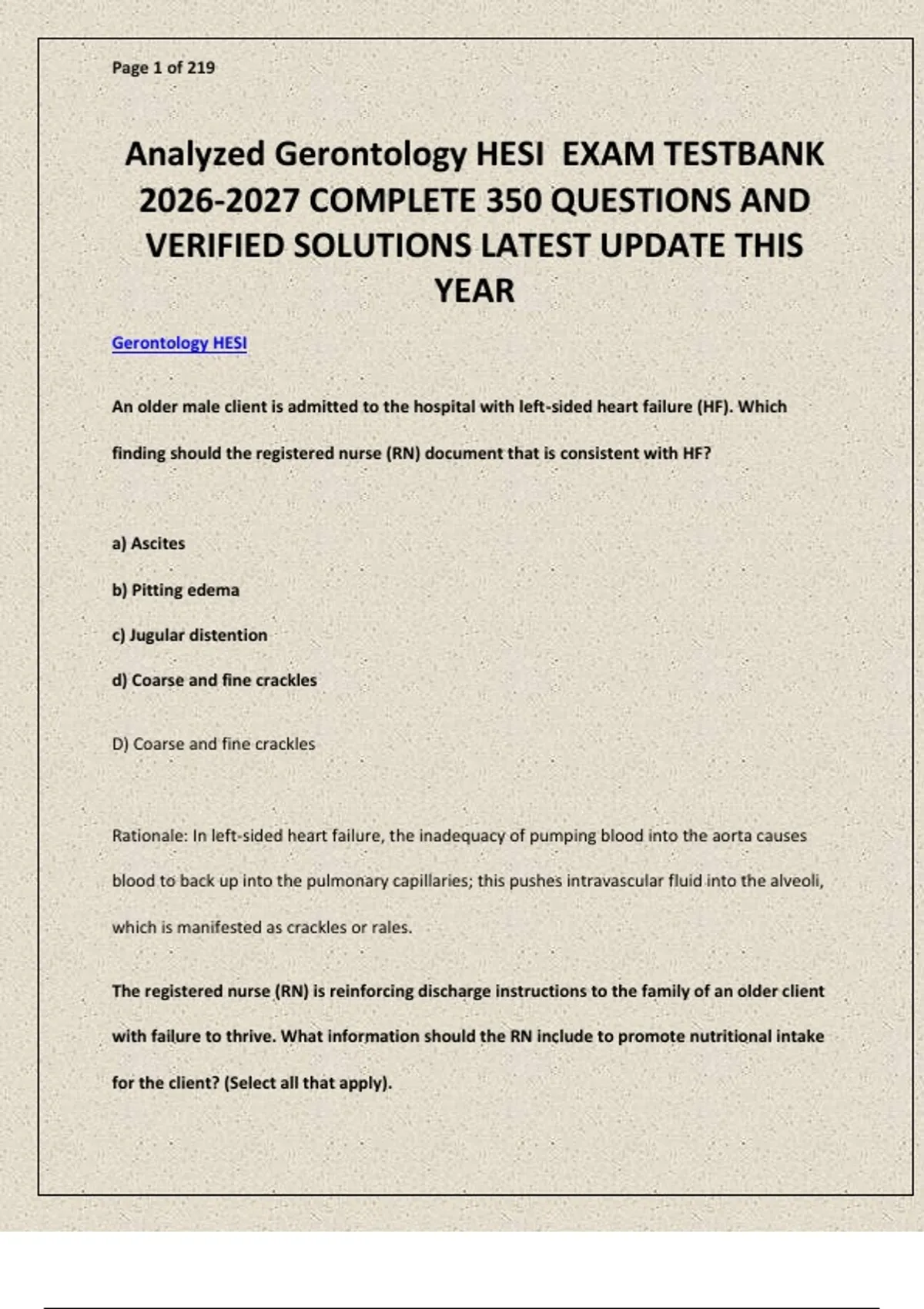Tap on AVAILABLE IN BUNDLE / PACKAGE DEAL to unlock free bonus exams — save more while getting everything you need! Analyzed Gerontology HESI Exam Testbank 2026–2027 – Complete 350 Questions with Verified Solutions PDF (Latest Update This Year) is a fully updated and comprehensive preparation resource for candidates preparing for the Gerontology HESI certification exam. This guide includes 350 exam-style questions with verified solutions, fully aligned with current HESI standards and industry best practices. Coverage includes aging physiology, geriatric assessment, chronic disease management, pharmacology for older adults, cognitive and mental health considerations, patient safety, care planning, and applied clinical scenarios. Questions are designed to strengthen technical knowledge, problem-solving skills, and practical decision-making in real-world geriatric nursing practice. Ideal for nursing students, clinical practitioners, and Gerontology HESI exam candidates, this resource provides thorough review, targeted practice, and confident exam performance for the 2026–2027 testing cycle.