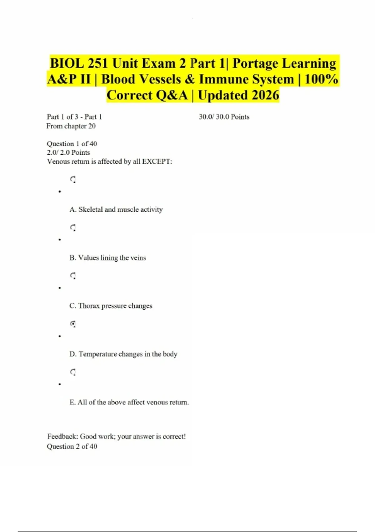 BIOL 251 Unit Exam 2 Part 1 | Portage Learning A&P II | Blood Vessels & Immune System | 100% Correct Q&A | Updated 2026