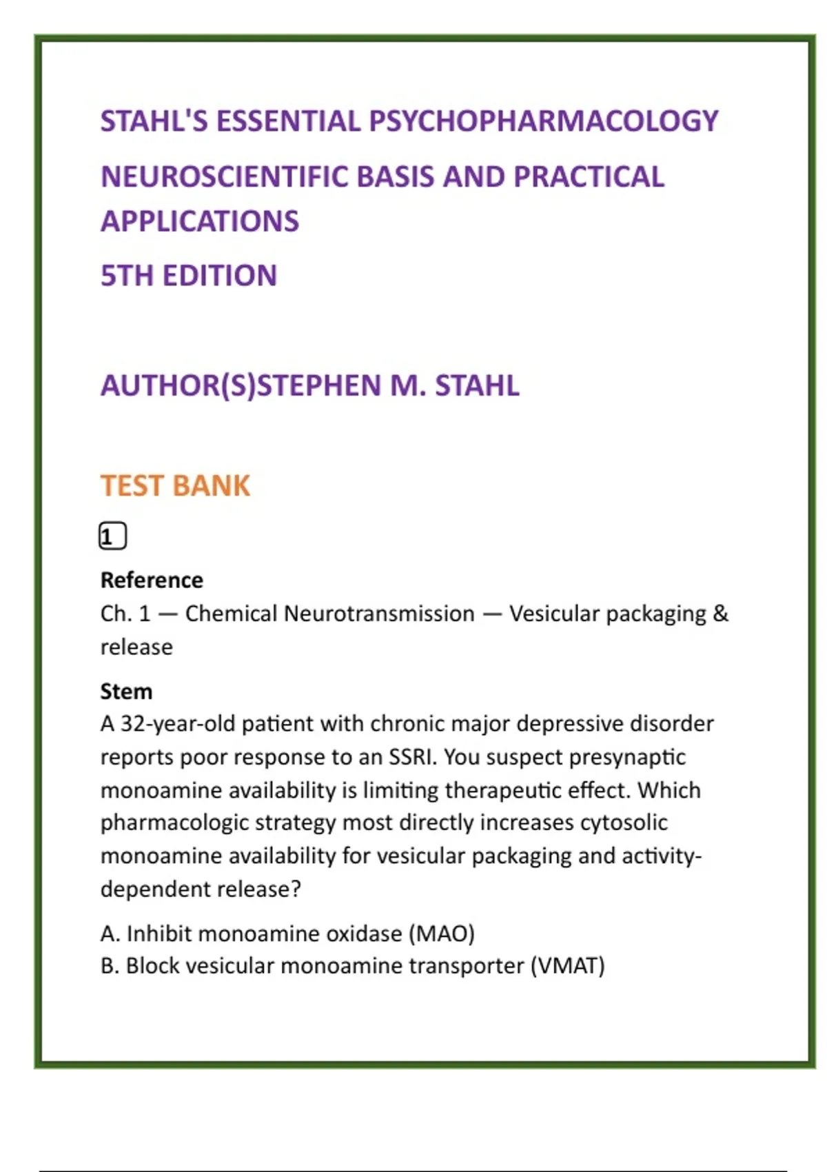 , symptoms. Stahl notes VMAT function as essential for