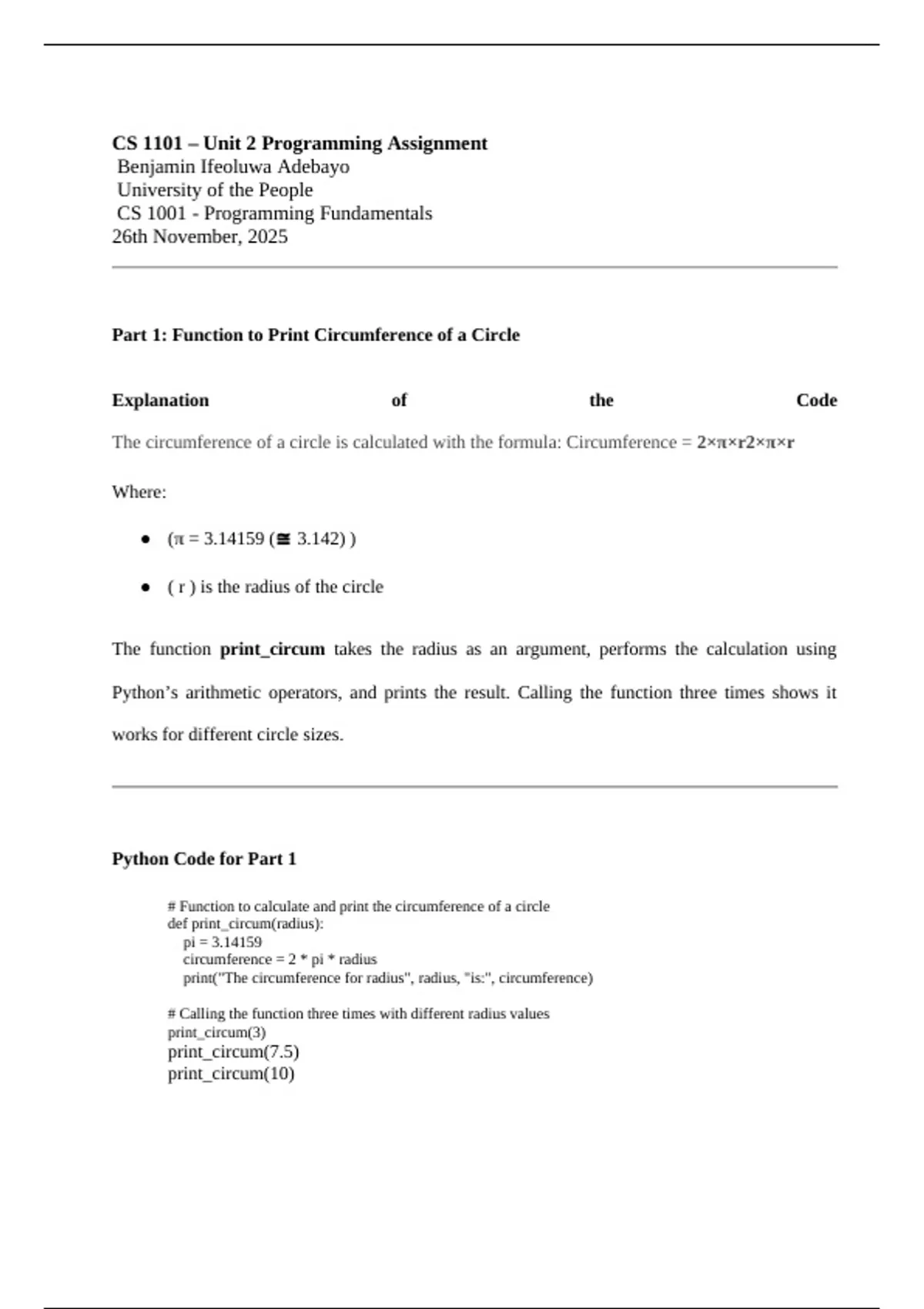 Part 1: Function to Print Circumference of a Circle