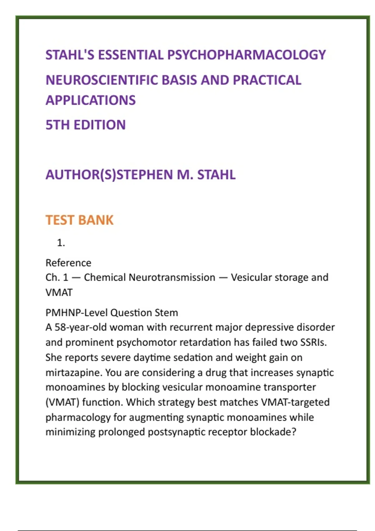 Stahl Psychopharmacology Test Bank | Stahl’s Essential Psychopharmacology 5th Ed | PMHNP & Psychiatric Nursing MCQs 2) SEO Product Description (200–300 words) Master advanced psychopharmacology with this comprehensive digital test bank based on Stahl’s Essential Psychopharmacology: Neuroscientific Basis and Practical Applications (5th Edition) by Stephen M. Stahl, the global gold standard for neuroscience-driven psychiatric education. This test bank provides FULL textbook coverage of ALL chapters and drug classes, with 20 NCLEX-style and graduate-level multiple-choice questions (MCQs) per chapter, each paired with detailed, evidence-based rationales grounded in neurobiology and clinical decision-making. Every question is designed to strengthen real-world psychiatric medication management skills, not rote memorization. Built specifically for psychiatric–mental health nursing and advanced practice learners, this resource reinforces core concepts in neurotransmitter systems, receptor pharmacology, mechanisms of action, indications, contraindications, adverse effects, and clinically significant drug interactions. Scenarios reflect authentic outpatient and inpatient psychiatric encounters across the lifespan, supporting safer, more confident prescribing and medication selection. Why this test bank works: Saves study time while maximizing retention through neuroscience-based explanations Strengthens clinical judgment for complex psychiatric medication decisions Improves exam performance on NCLEX-RN®, PMHNP certification, and graduate-level exams Ideal for students and clinicians in: Psychiatric–Mental Health Nursing Advanced Psychopharmacology PMHNP, MSN, and DNP programs Behavioral Health Nursing Neuroscience & Clinical Psychiatry courses Stephen M. Stahl’s framework is trusted worldwide for translating neuroscience into practical psychiatric care—this test bank helps you apply it with precision and confidence. Digital download. Instant access. Exam-focused results. 3) 8 High-Value SEO Keywords Stahl psychopharmacology test bank Stahl’s Essential Psychopharmacology 5th edition psychiatric nursing pharmacology MCQs psychopharmacology exam questions mental health nursing study guide PMHNP pharmacology test bank neuroscience-based psychopharmacology psychiatric medication management questions 4) 10 Hashtags #StahlPsychopharmacology #PsychiatricNursing #PMHNPExamPrep #Psychopharmacology #MentalHealthNursing #NeuroscienceEducation #NursingTestBank #AdvancedPracticeNursing #BehavioralHealth #ClinicalPsychiatry