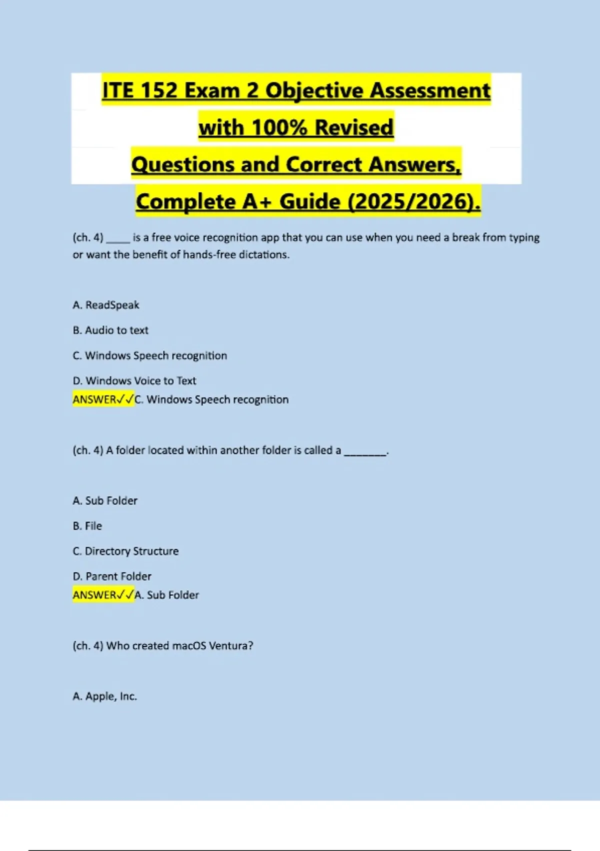 ITE 152 Exam 2 Objective Assessment with 100% Revised Questions and Correct Answers, Complete A+ Guide (2025/2026).