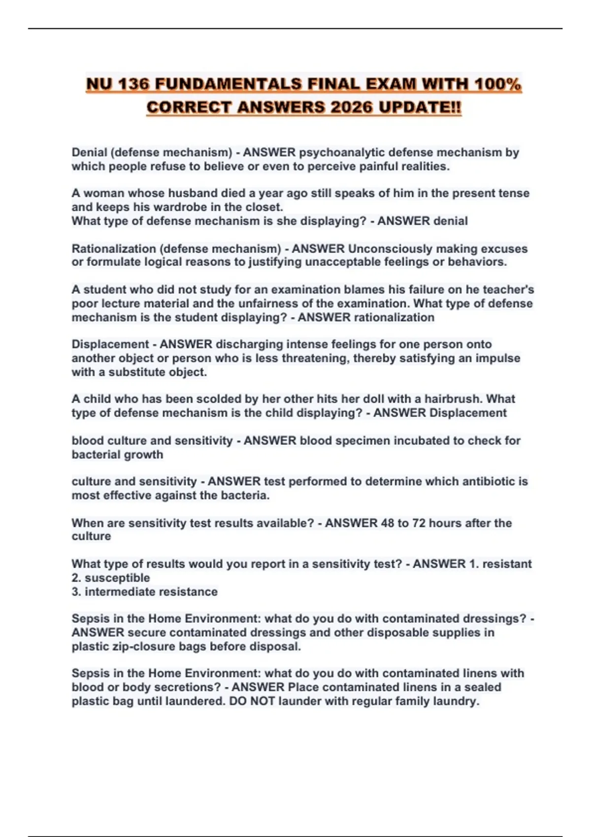 Prepare for the NU 136 Fundamentals Final Exam with this comprehensive study guide. This resource includes key practice questions, detailed answers, and essential nursing concepts to help you succeed in the 2026/2027 exam. Master the material and boost your chances of acing the final exam with expert-reviewed solutions.