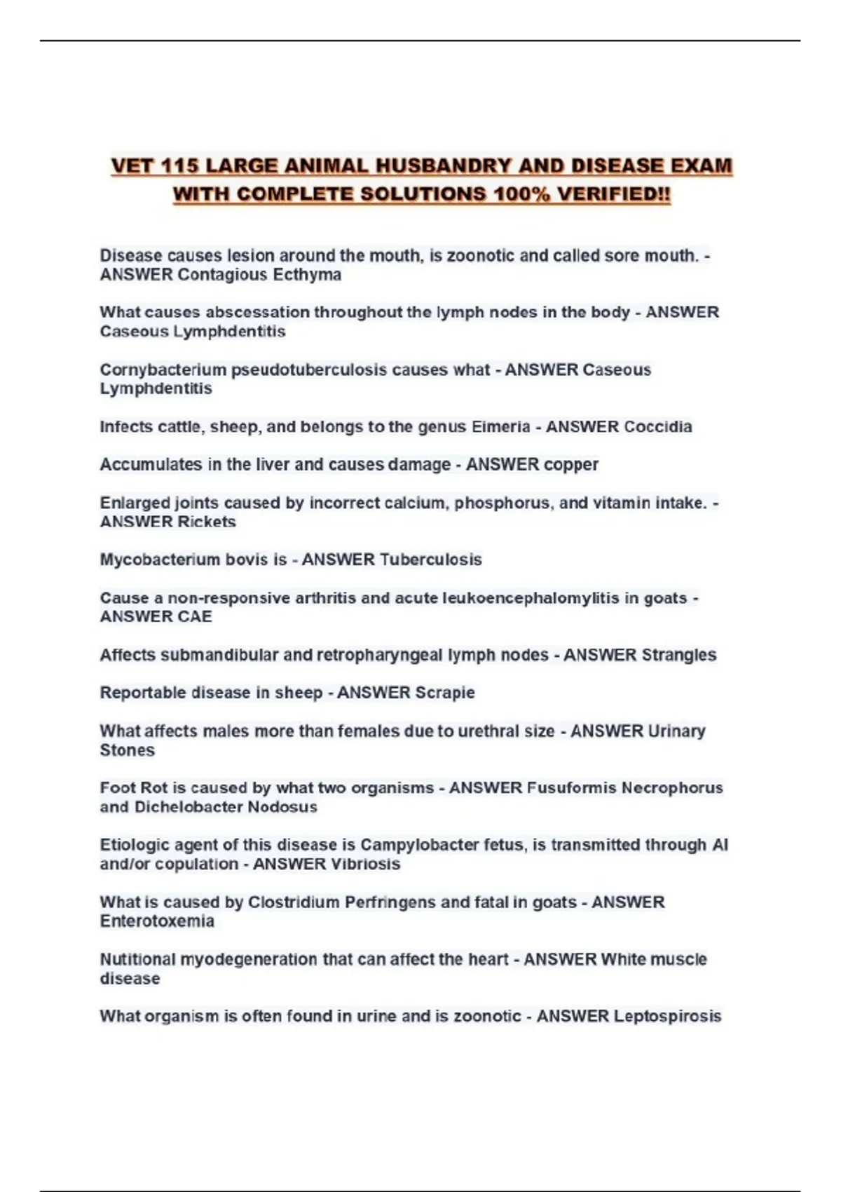 VET 115 LARGE ANIMAL HUSBANDRY AND DISEASE EXAM WITH COMPLETE SOLUTIONS 100% VERIFIED!!...