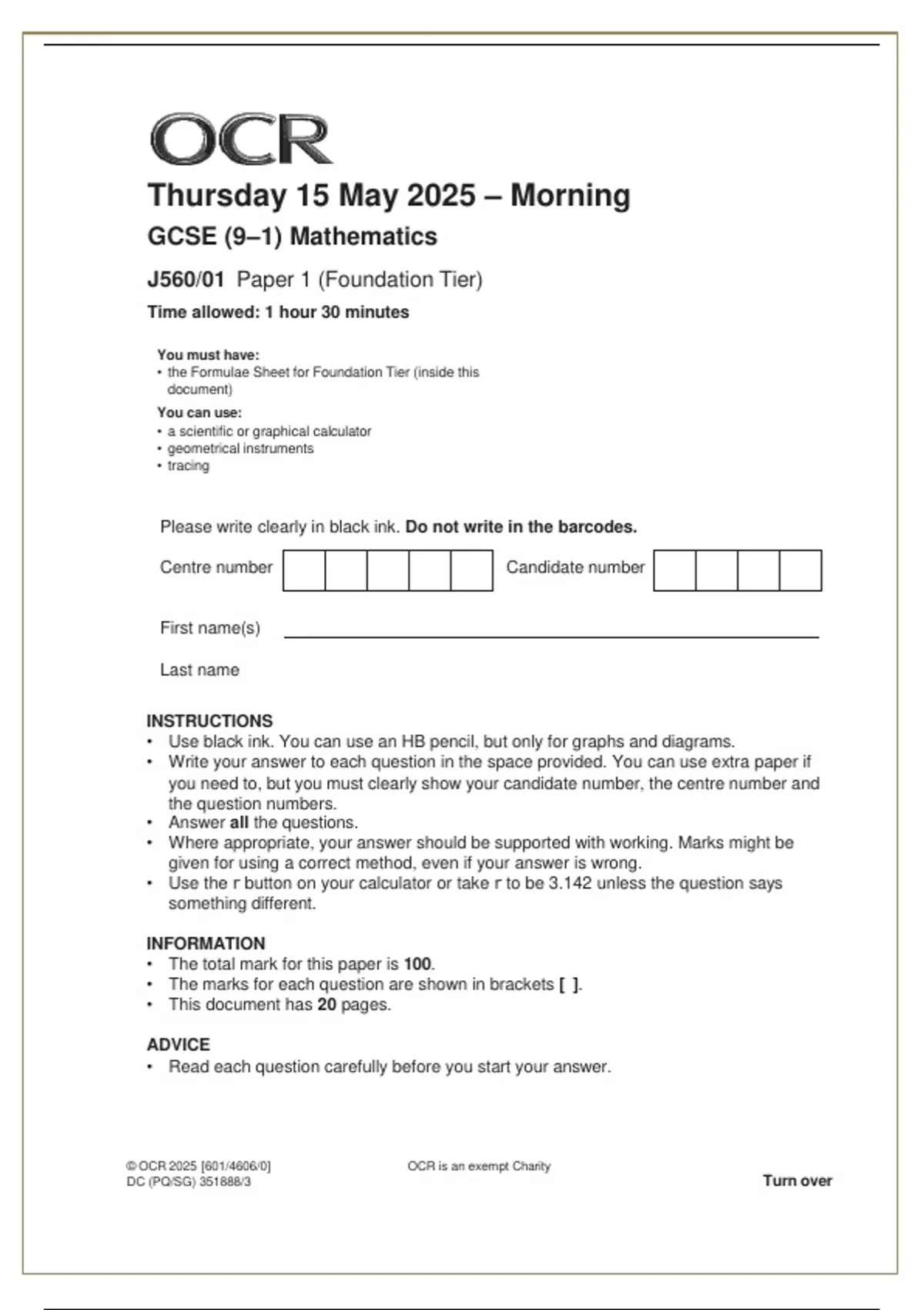 • the Formulae Sheet for Foundation Tier (inside this