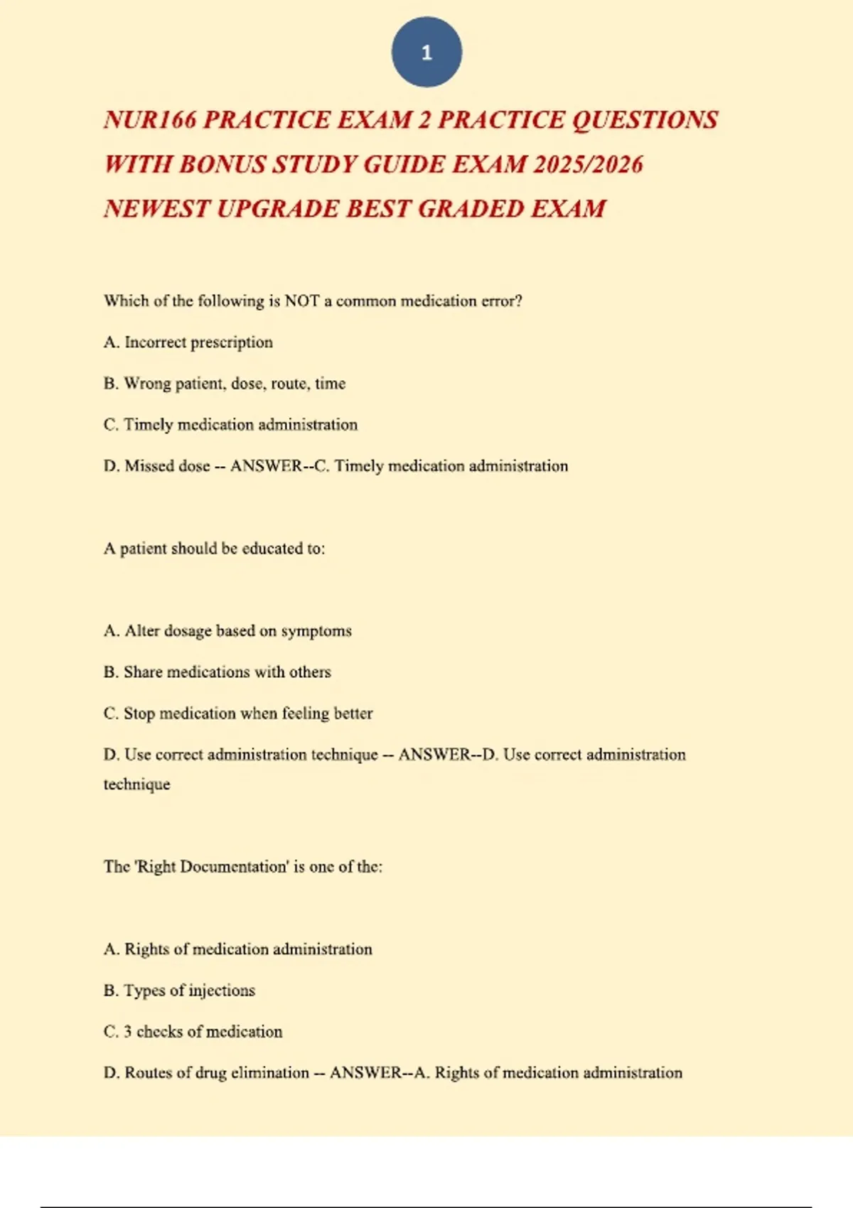 Prepare for NUR166 in 2026 with Practice Exam 2 featuring verified questions and expert answers. Perfect for nursing students to master concepts, practice effectively, and excel in exams this year.