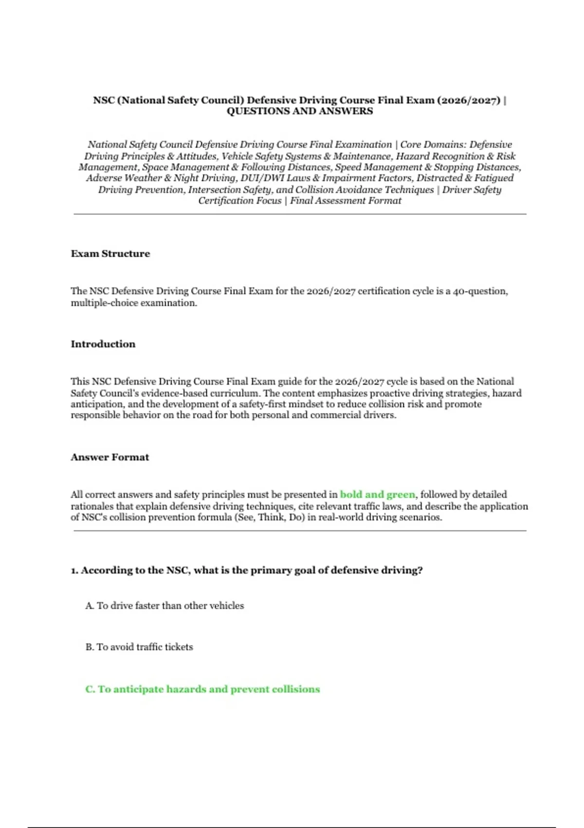 This NSC Defensive Driving Course Final Exam guide for the 2026/2027 cycle is based on the National