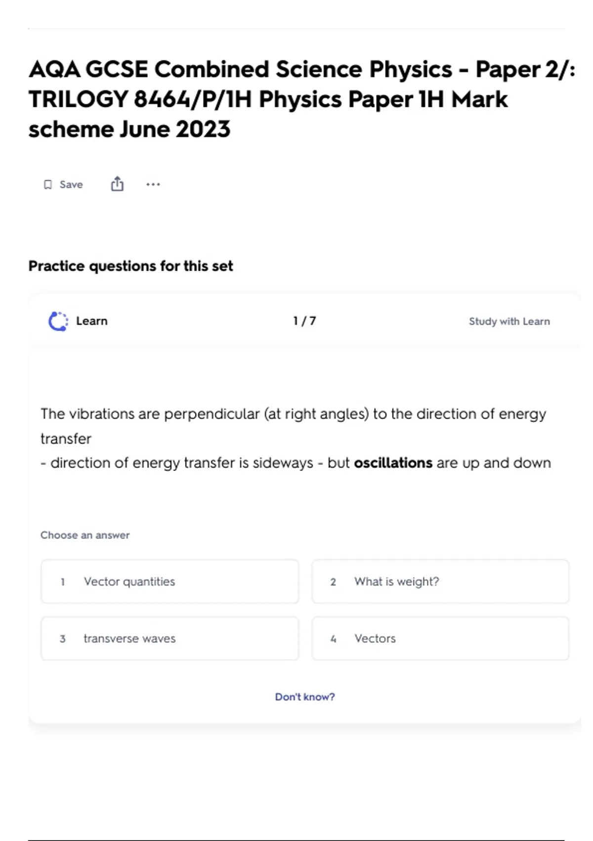 TRILOGY 8464/P/1H Physics Paper 1H Mark