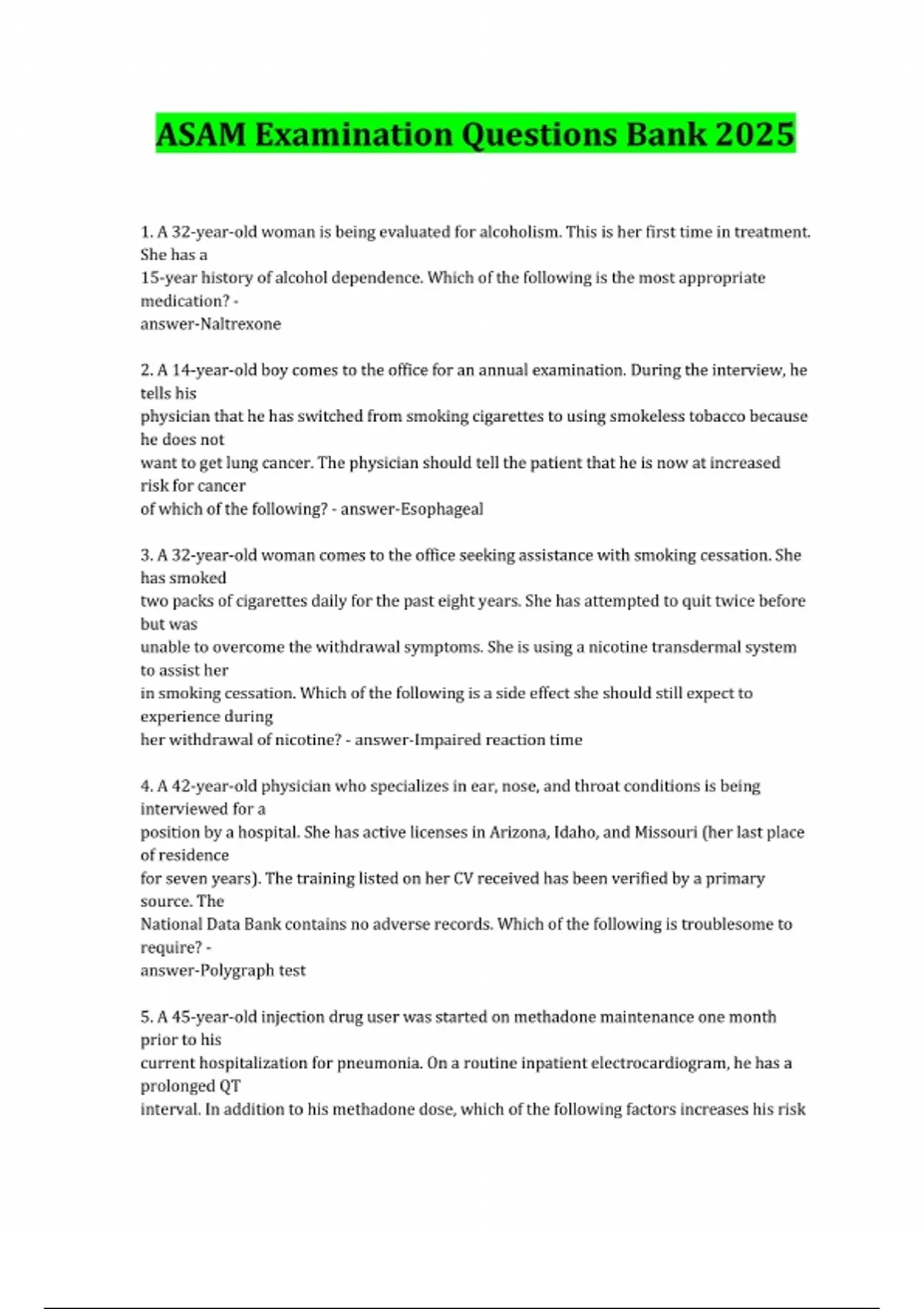 ASAM Examination Questions Bank 2025 1. A 32-year-old woman is being evaluated for alcoholism. This is her first time in treatment. She has a 15-year history of alcohol dependence. Which of the following is the most appropriate medication? - answer-Naltrexone 2. A 14-year-old boy comes to the office for an annual examination. During the interview, he tells his physician that he has switched from smoking cigarettes to using smokeless tobacco because he does not want to get lung cancer. The physician should tell the patient that he is now at increased risk for cancer of which of the following? - answer-Esophageal 3. A 32-year-old woman comes to the office seeking assistance with smoking cessation. She has smoked two packs of cigarettes daily for the past eight years. She has attempted to quit twice before but was unable to overcome the withdrawal symptoms. She is using a nicotine transdermal system to assist her in smoking cessation. Which of the following is a side effect she should still expect to experience during her withdrawal of nicotine? - answer-Impaired reaction time 4. A 42-year-old physician who specializes in ear, nose, and throat conditions is being interviewed for a position by a hospital. She has active licenses in Arizona, Idaho, and Missouri (her last place of residence for seven years). The training listed on her CV received has been verified by a primary source. The National Data Bank contains no adverse records. Which of the following is troublesome to require? - answer-Polygraph test 5. A 45-year-old injection drug user was started on methadone maintenance one month prior to his current hospitalization for pneumonia. On a routine inpatient electrocardiogram, he has a prolonged QT interval. In addition to his methadone dose, which of the following factors increases his risk for developing an arrhythmia? - answer-Hypokalemia