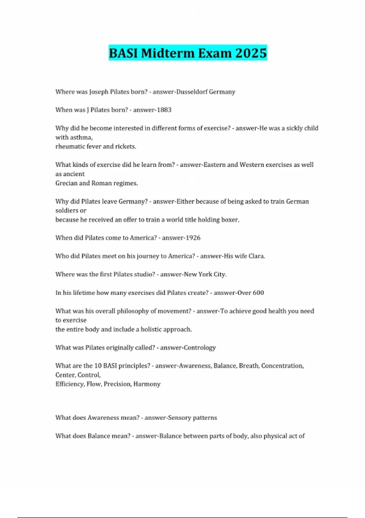 BASI Midterm Exam 2025 Where was Joseph Pilates born? - answer-Dusseldorf Germany When was J Pilates born? - answer-1883 Why did he become interested in different forms of exercise? - answer-He was a sickly child with asthma, rheumatic fever and rickets. What kinds of exercise did he learn from? - answer-Eastern and Western exercises as well as ancient Grecian and Roman regimes. Why did Pilates leave Germany? - answer-Either because of being asked to train German soldiers or because he received an offer to train a world title holding boxer. When did Pilates come to America? - answer-1926 Who did Pilates meet on his journey to America? - answer-His wife Clara. Where was the first Pilates studio? - answer-New York City. In his lifetime how many exercises did Pilates create? - answer-Over 600 What was his overall philosophy of movement? - answer-To achieve good health you need to exercise the entire body and include a holistic approach. What was Pilates originally called? - answer-Contrology What are the 10 BASI principles? - answer-Awareness, Balance, Breath, Concentration, Center, Control, Efficiency, Flow, Precision, Harmony What does Awareness mean? - answer-Sensory patterns What does Balance mean? - answer-Balance between parts of body, also physical act of balancing
