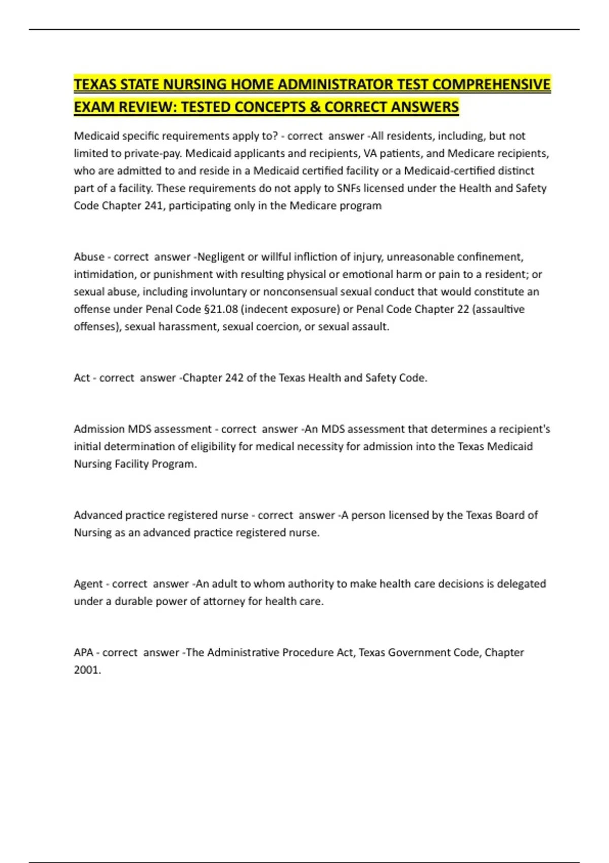 Texas State Nursing Home Administrator Test Comprehensive Exam Review: Tested Concepts & Correct Answers