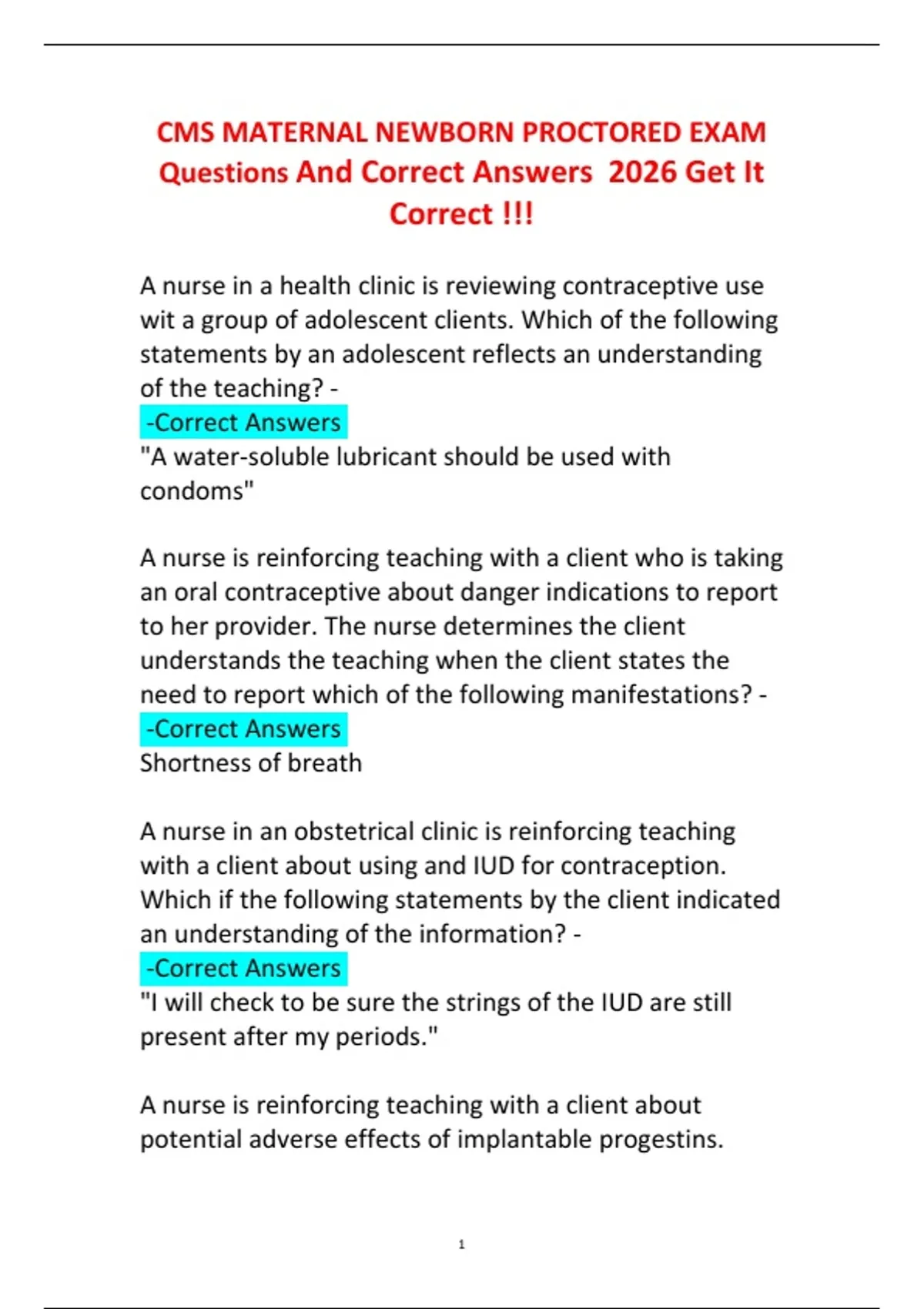 CMS MATERNAL NEWBORN PROCTORED EXAM