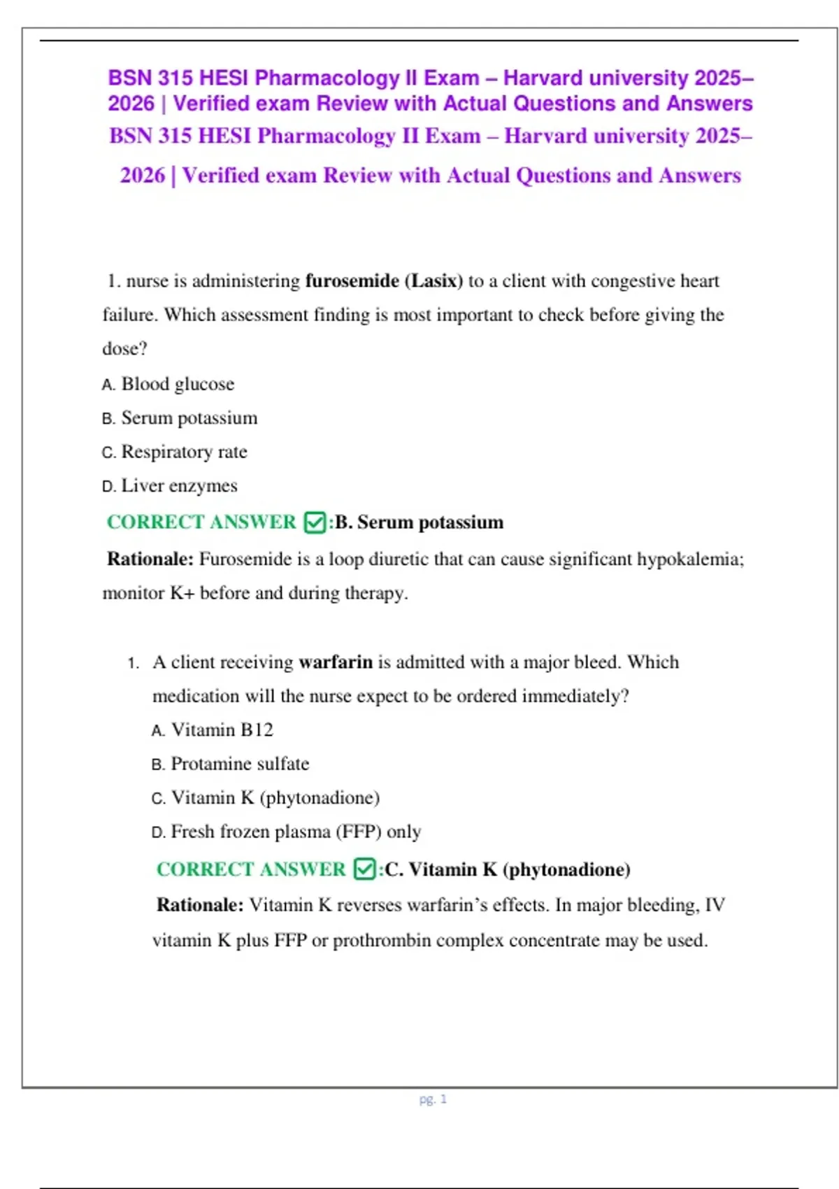 BSN 315 HESI Pharmacology II Exam – Harvard university 2025–