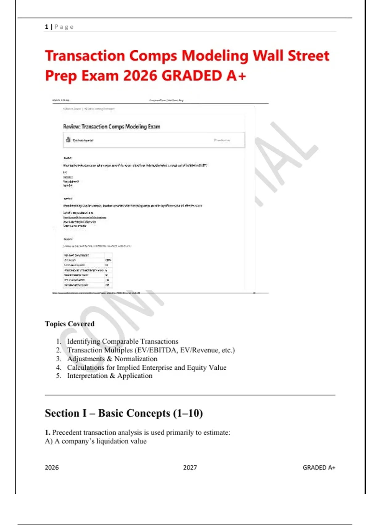 This document contains graded A+ answers for the Transaction Comparables (Comps) Modeling exam aligned with Wall Street Prep 2026 standards. It includes a complete precedent transactions analysis with valuation multiples, adjustments, and clear exam-ready formatting. Ideal for students preparing for investment banking, valuation, and advanced financial modeling exams.