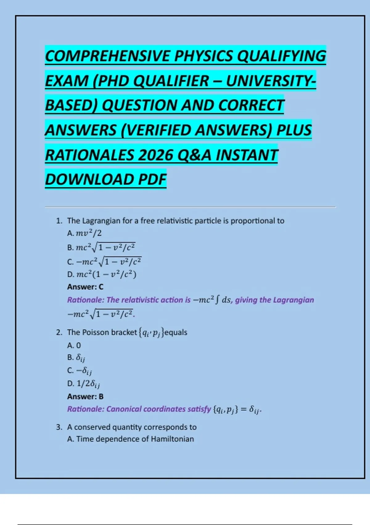 COMPREHENSIVE PHYSICS QUALIFYING EXAM (PHD QUALIFIER – UNIVERSITY BASED) QUESTION AND CORRECT ANSWERS (VERIFIED ANSWERS) PLUS RATIONALES 2026 Q&A INSTANT DOWNLOAD PDF