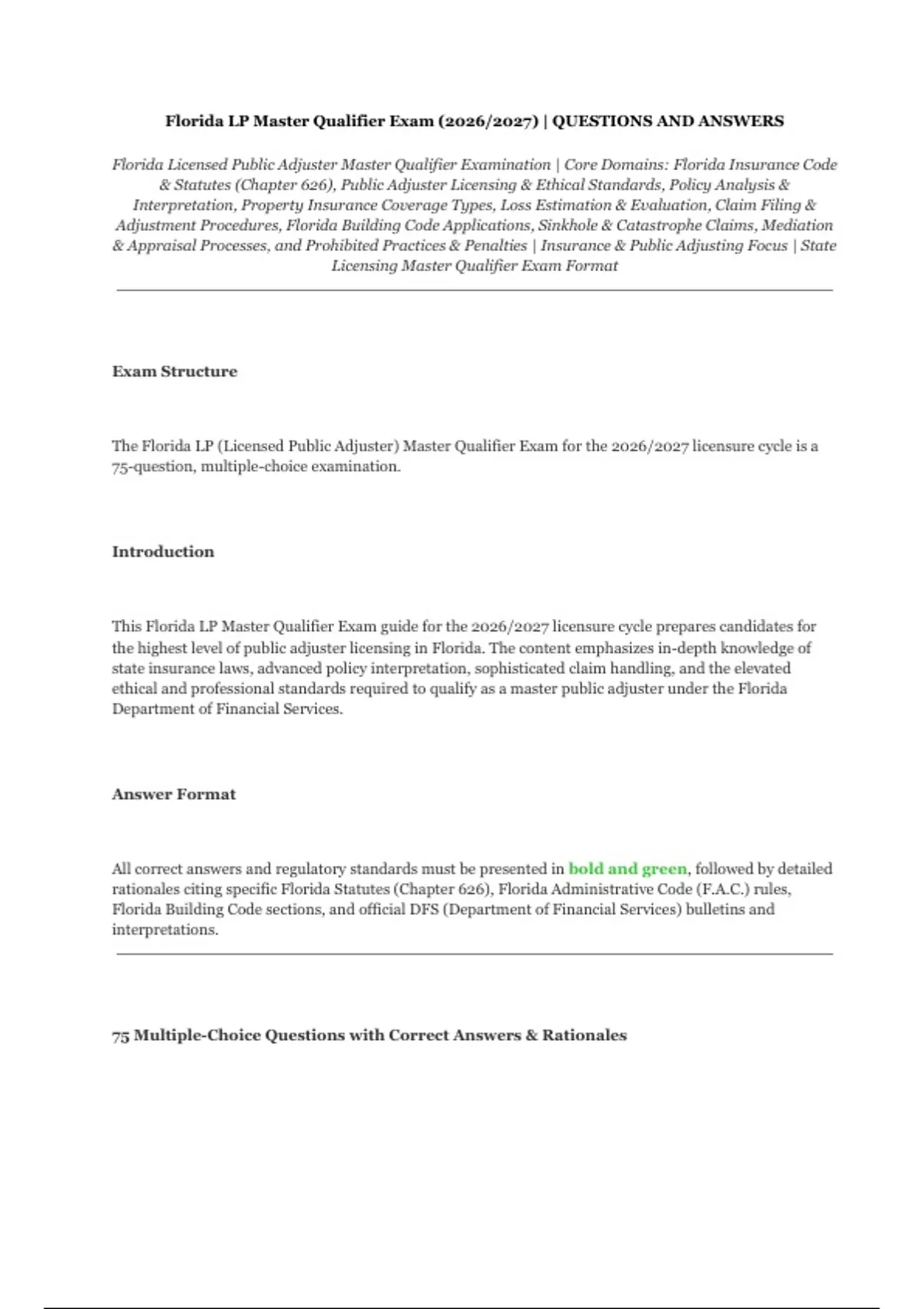 This document contains Florida Licensed Public Adjuster (LP) Master Qualifier exam questions with correct answers, designed for candidates preparing for state licensure. It covers Florida insurance statutes and regulations (Chapter 626), public adjuster licensing requirements and ethical standards, policy analysis and interpretation, property insurance coverage types, loss estimation and evaluation, and claims filing and adjustment procedures. Additional focus areas include Florida Building Code applications, sinkhole and catastrophe claims, mediation and appraisal processes, and prohibited practices and penalties, aligned with the official master qualifier exam format for the 2026/2027 cycle.