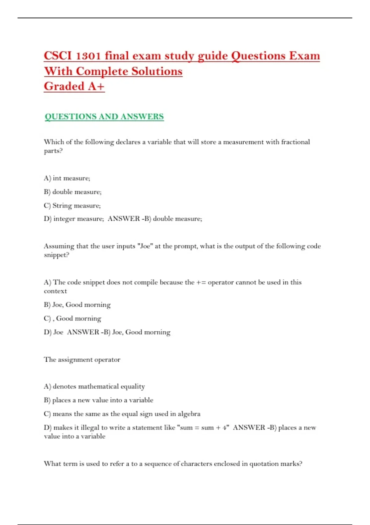 CSCI 1301 final exam study guide Questions Exam With Complete Solutions Graded A+