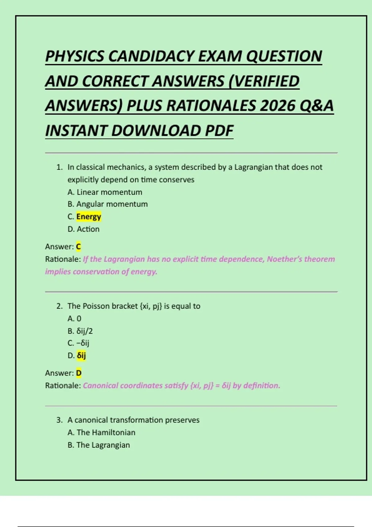 PHYSICS CANDIDACY EXAM QUESTION AND CORRECT ANSWERS (VERIFIED ANSWERS) PLUS RATIONALES 2026 Q&A INSTANT DOWNLOAD PDF
