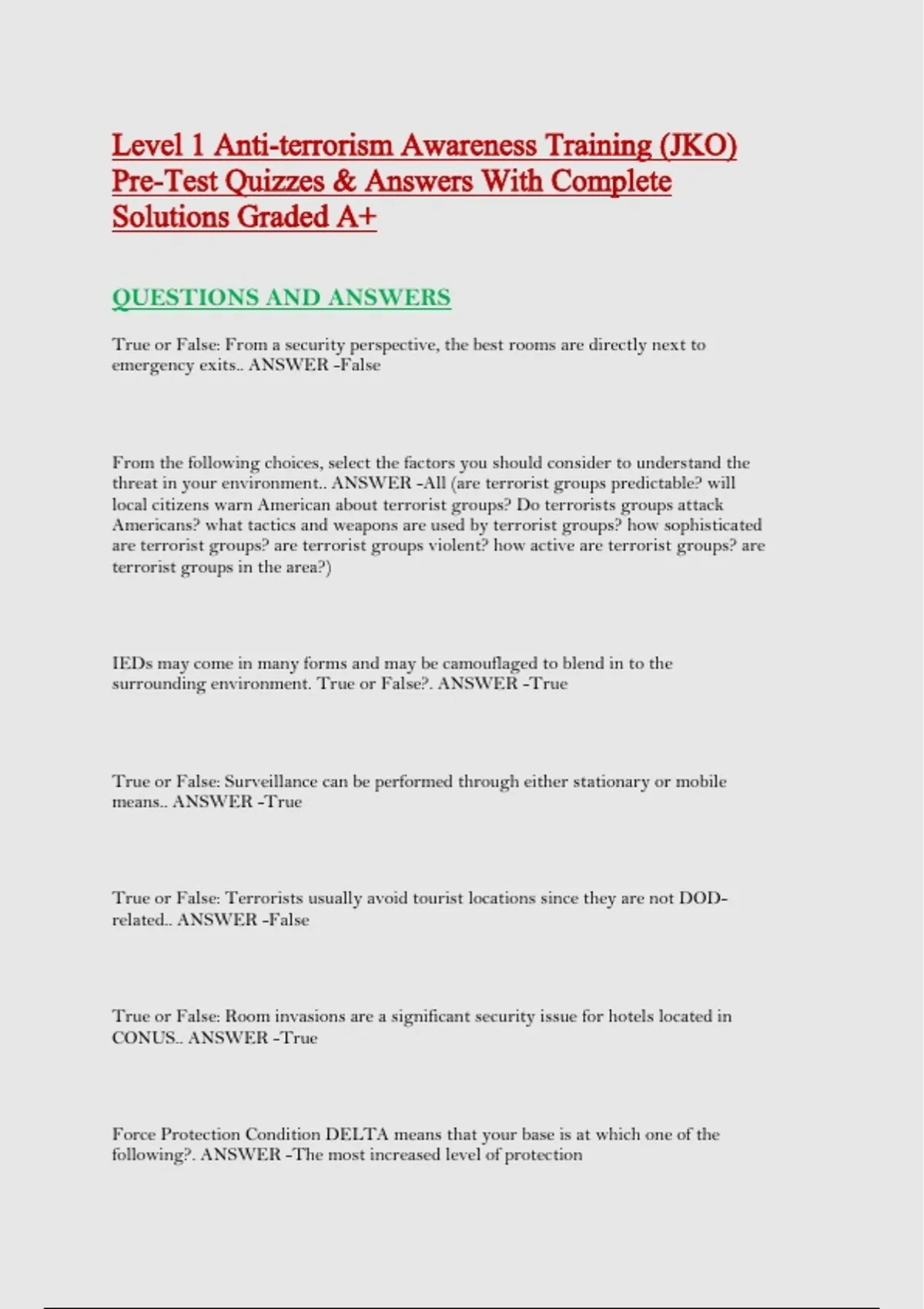 Level 1 Anti-terrorism Awareness Training (JKO) Pre-Test Quizzes & Answers With Complete Solutions