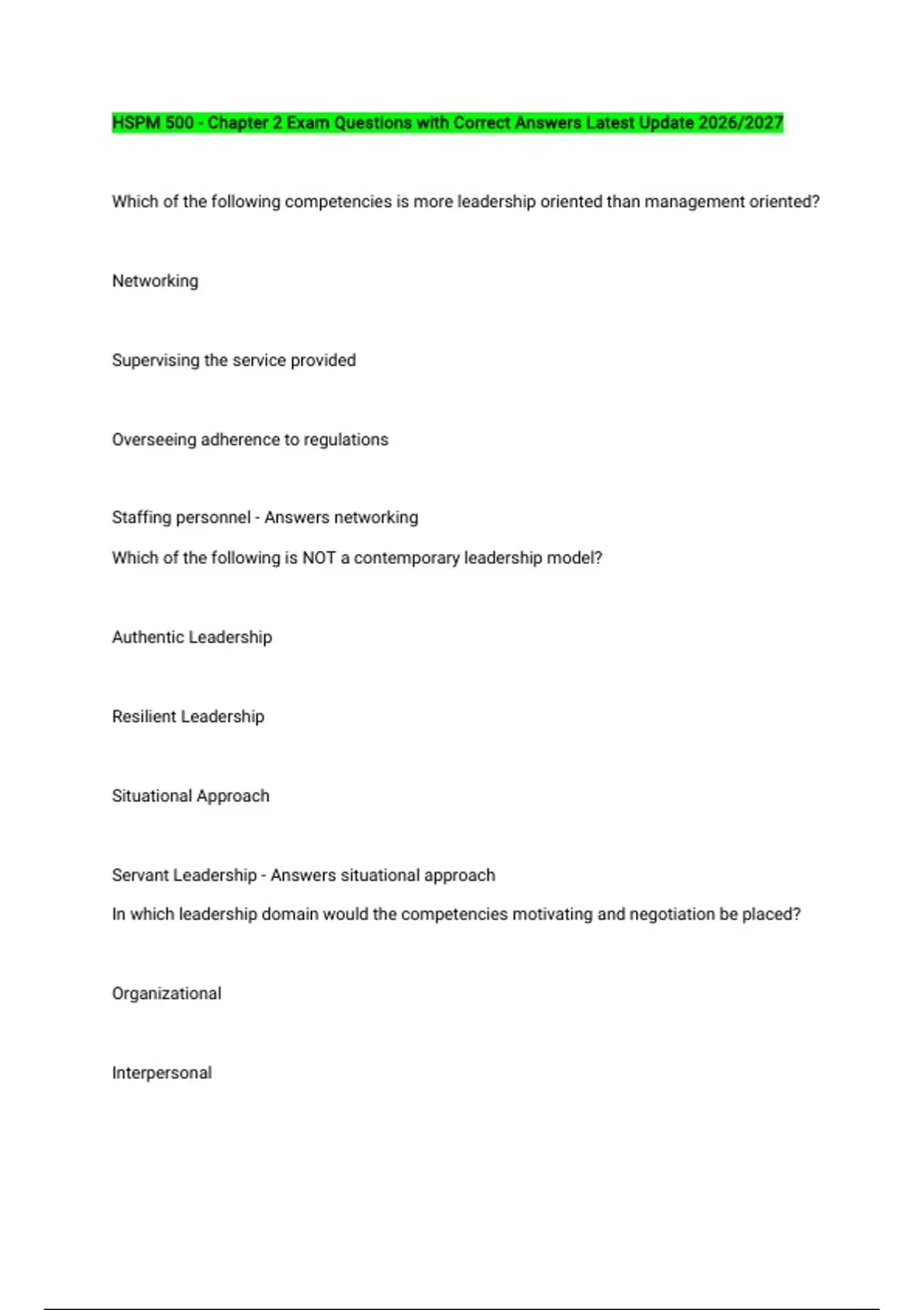 HSPM 500 - Chapter 2 Exam Questions with Correct Answers Latest Update 2026/2027 Which of the following competencies is more leadership oriented than management oriented? Networking Supervising the service provided Overseeing adherence to regulations Staffing personnel - Answers networking Which of the following is NOT a contemporary leadership model? Authentic Leadership Resilient Leadership Situational Approach Servant Leadership - Answers situational approach In which leadership domain would the competencies motivating and negotiation be placed? Organizational Interpersonal Functional and Technical Self-Development and Self-Understanding - Answers interpersonal Which is a new trend for health care governance? Manage change Focus on competence of individual providers Larger boards Fiduciary and strategic responsibilities - Answers Manage change Which is a guideline for health care leaders when being responsible to their organization as per the ACHE Code of Ethics? Proper resource allocation Have a process to evaluate quality of care Provide appropriate access to services Ensure a safe workplace environment - Answers Proper resource allocation Which is NOT a type of leader/follower that is needed to produce an interdependent leadership system? Transformational