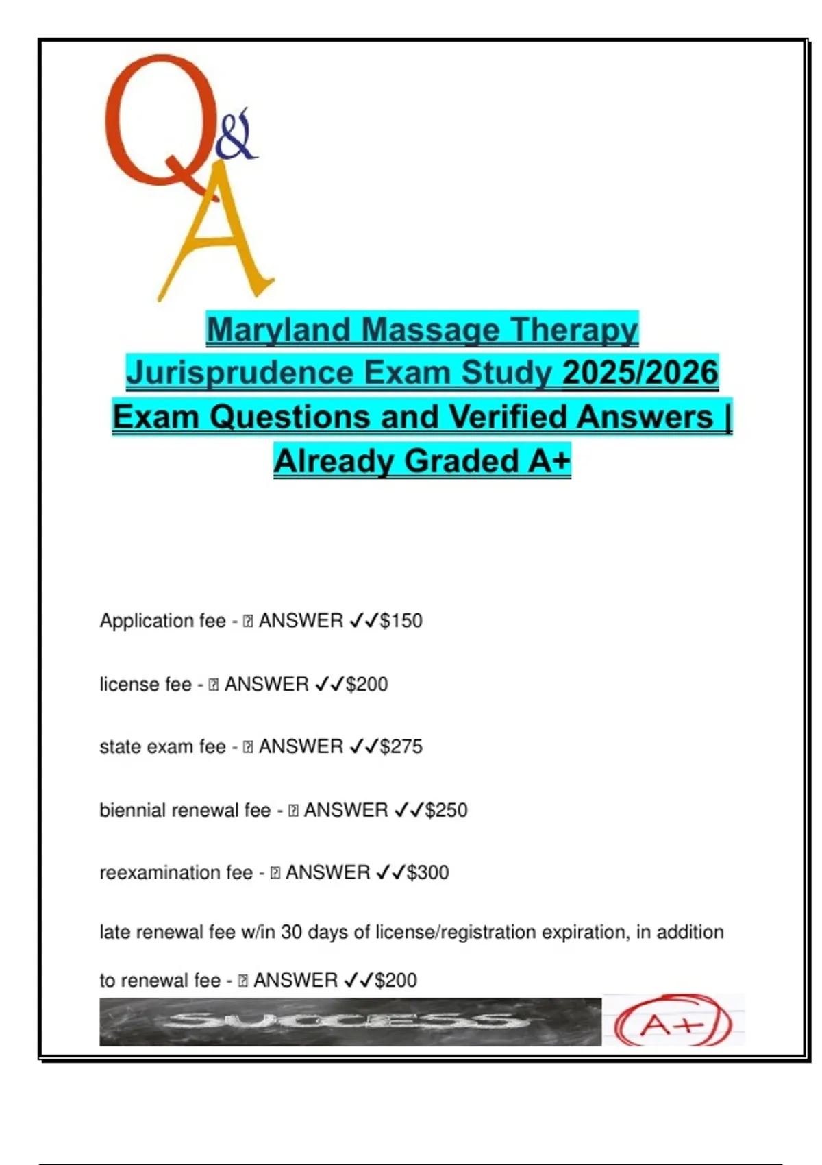 This document includes 100+ graded and verified questions with answers specifically tailored for the Maryland Massage Therapy Jurisprudence Exam for the 2025/2026 certification cycle. It aligns with COMAR Title 10.65 and the Maryland Health Occupations Article, making it a high-accuracy resource for students and professionals preparing for massage licensure in Maryland. Each item is presented in an exam-style Q&A format, ideal for rapid recall, legal understanding, and test readiness. Topics include: Licensing and Registration: Definitions and differences between LMT and RMP, healthcare vs. non-healthcare settings, and display requirements COMAR-Defined Fees: Application ($150), exam ($275), renewal ($250), reexamination ($300), reinstatement, verification, and late penalties Massage Scope and Exclusions: Manual techniques, cold/heat pack usage, what massage does not legally include (diagnosis, spinal manipulation, energy healing) Education Standards: 600 classroom hours including 100 hours in anatomy, physiology, pathology, and kinesiology; CPR required but not counted; no correspondence courses accepted Ethical Conduct: Definitions of therapeutic deception, non-bona fide treatment, sexually exploitative relationships, and required professional judgment in client care Recordkeeping & Client Access: Maintain client records for at least 5 years after treatment ends, provide access on request, and arrange care during absence Administrative Rules: Board's reasons for license denial, mandatory address updates within 60 days, and $100 penalty for non-compliance This document is best suited for: Massage therapy students in Maryland preparing for jurisprudence testing LMT/RMP applicants from other states seeking Maryland licensure Instructors and training institutions offering licensing exam prep Clinics, educators, and compliance officers teaching or verifying state regulatory compliance It’s a practical, clear, and legally accurate guide that reflects real-world Maryland practice laws and prepares candidates for the legal aspects of licensure and professional accountability. Keywords: Maryland massage exam, COMAR 10.65, jurisprudence 2025, massage licensing fees, LMT RMP Maryland, client records retention, therapeutic deception, massage ethics Maryland, massage therapy education, registration renewal, board penalties, professional boundaries
