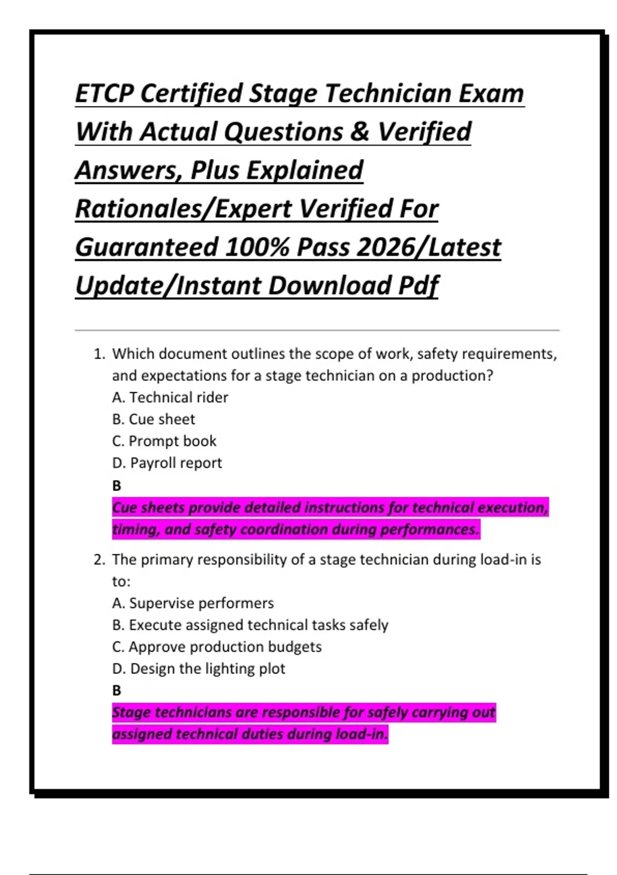 ETCP Certified Stage Technician Exam With Actual Questions & Verified Answers, Plus Explained Rationales/Expert Verified For Guaranteed 100% Pass 2026/Latest Update/Instant Download Pdf