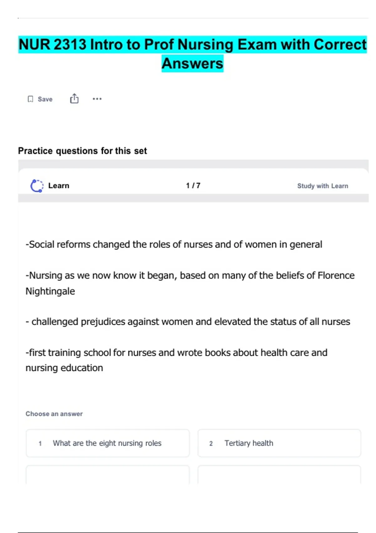 NUR 2313 Intro to Prof Nursing Exam with Correct