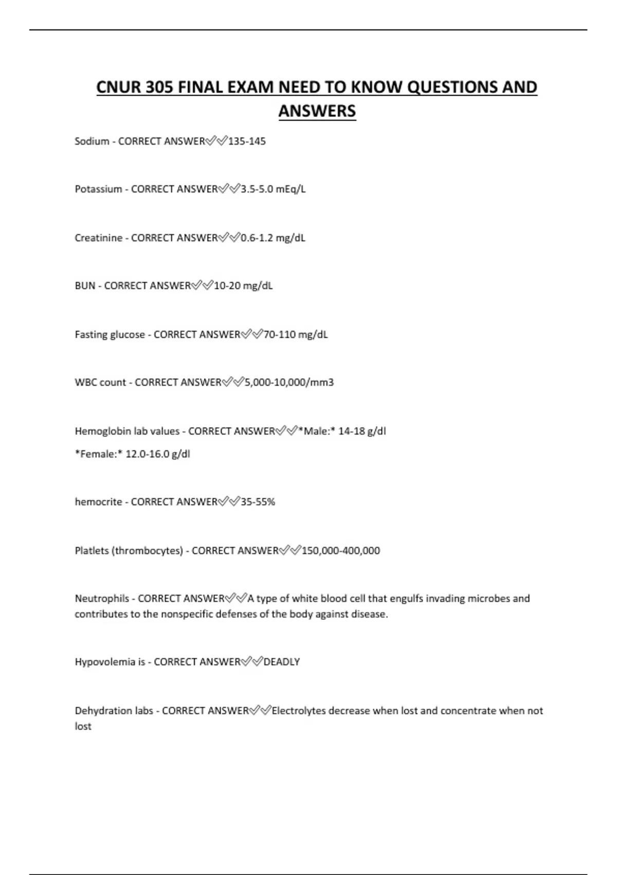 CNUR 305 FINAL EXAM NEED TO KNOW QUESTIONS AND ANSWERS Sodium - CORRECT ANSWER135-145 Potassium - CORRECT ANSWER3.5-5.0 mEq/L