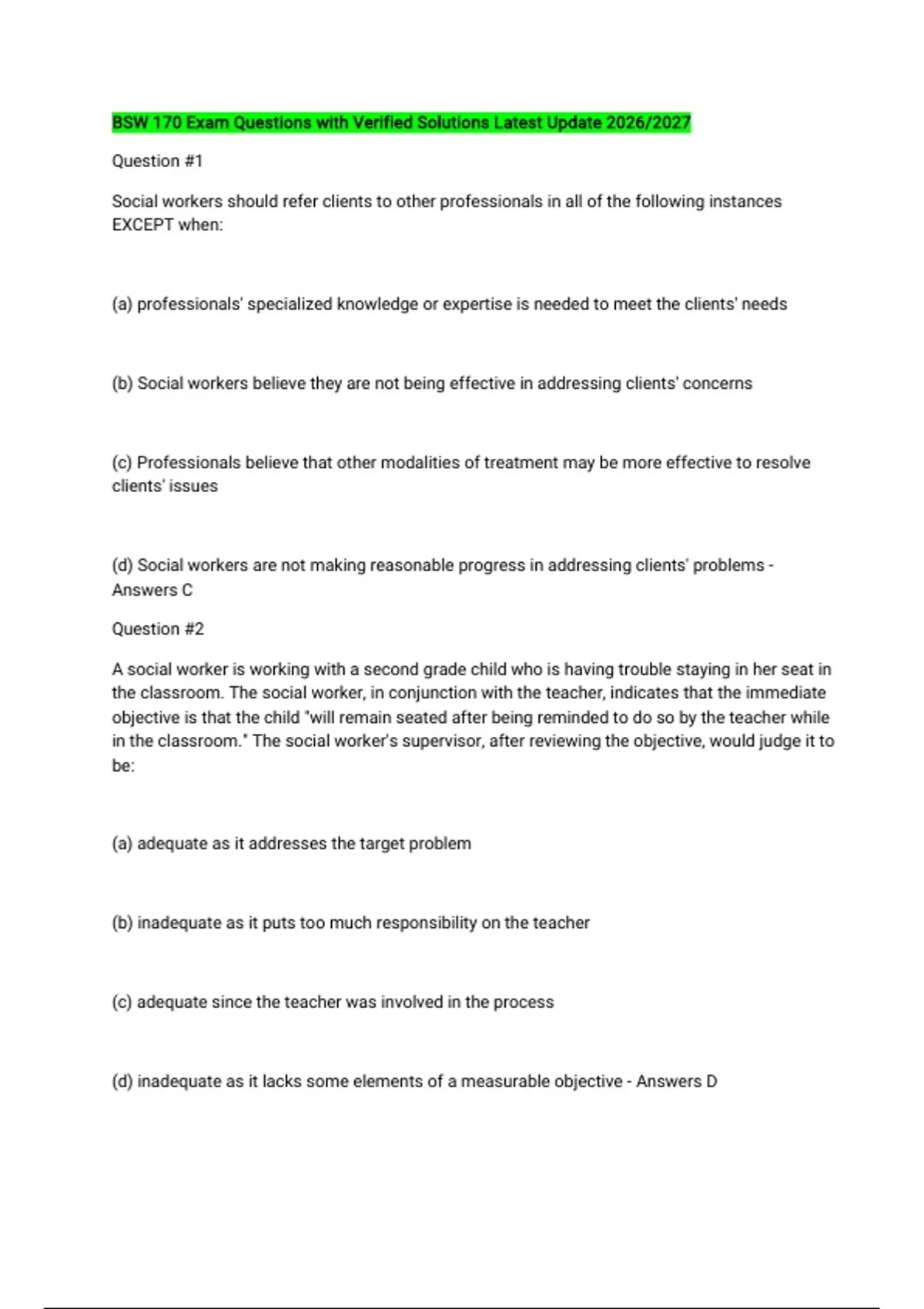 BSW 170 Exam Questions with Verified Solutions Latest Update 2026/2027 Question #1 Social workers should refer clients to other professionals in all of the following instances EXCEPT when: (a) professionals' specialized knowledge or expertise is needed to meet the clients' needs (b) Social workers believe they are not being effective in addressing clients' concerns (c) Professionals believe that other modalities of treatment may be more effective to resolve clients' issues (d) Social workers are not making reasonable progress in addressing clients' problems - Answers C Question #2 A social worker is working with a second grade child who is having trouble staying in her seat in the classroom. The social worker, in conjunction with the teacher, indicates that the immediate objective is that the child "will remain seated after being reminded to do so by the teacher while in the classroom." The social worker's supervisor, after reviewing the objective, would judge it to be: (a) adequate as it addresses the target problem (b) inadequate as it puts too much responsibility on the teacher (c) adequate since the teacher was involved in the process (d) inadequate as it lacks some elements of a measurable objective - Answers D Question #3 A social worker may limit a client's self-determination when the client's actions: (a) pose a serious and imminent risk to self or others according to the social worker's judgment (b) cause significant family dysfunction which threatens to impact on the psychological well-being of its members