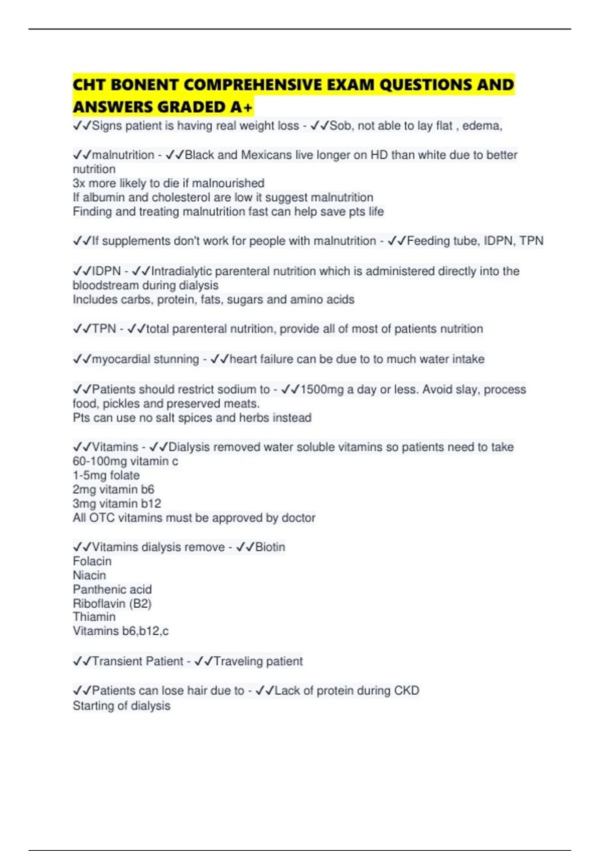 CHT BONENT COMPREHENSIVE EXAM QUESTIONS AND ANSWERS GRADED A+