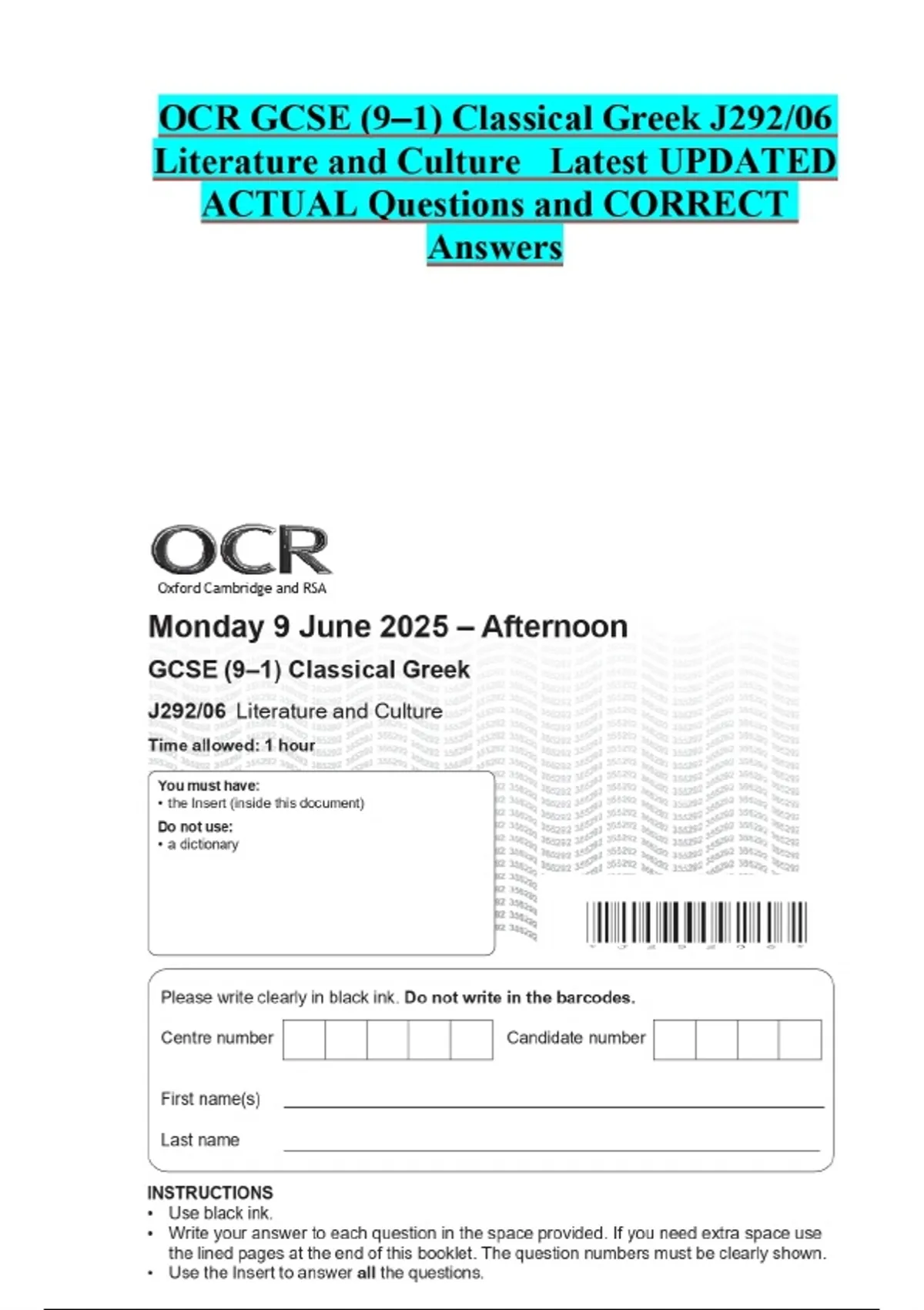OCR GCSE (9–1) Classical Greek J292/06 Literature and Culture Latest UPDATED ACTUAL Questions and CORRECT Answers