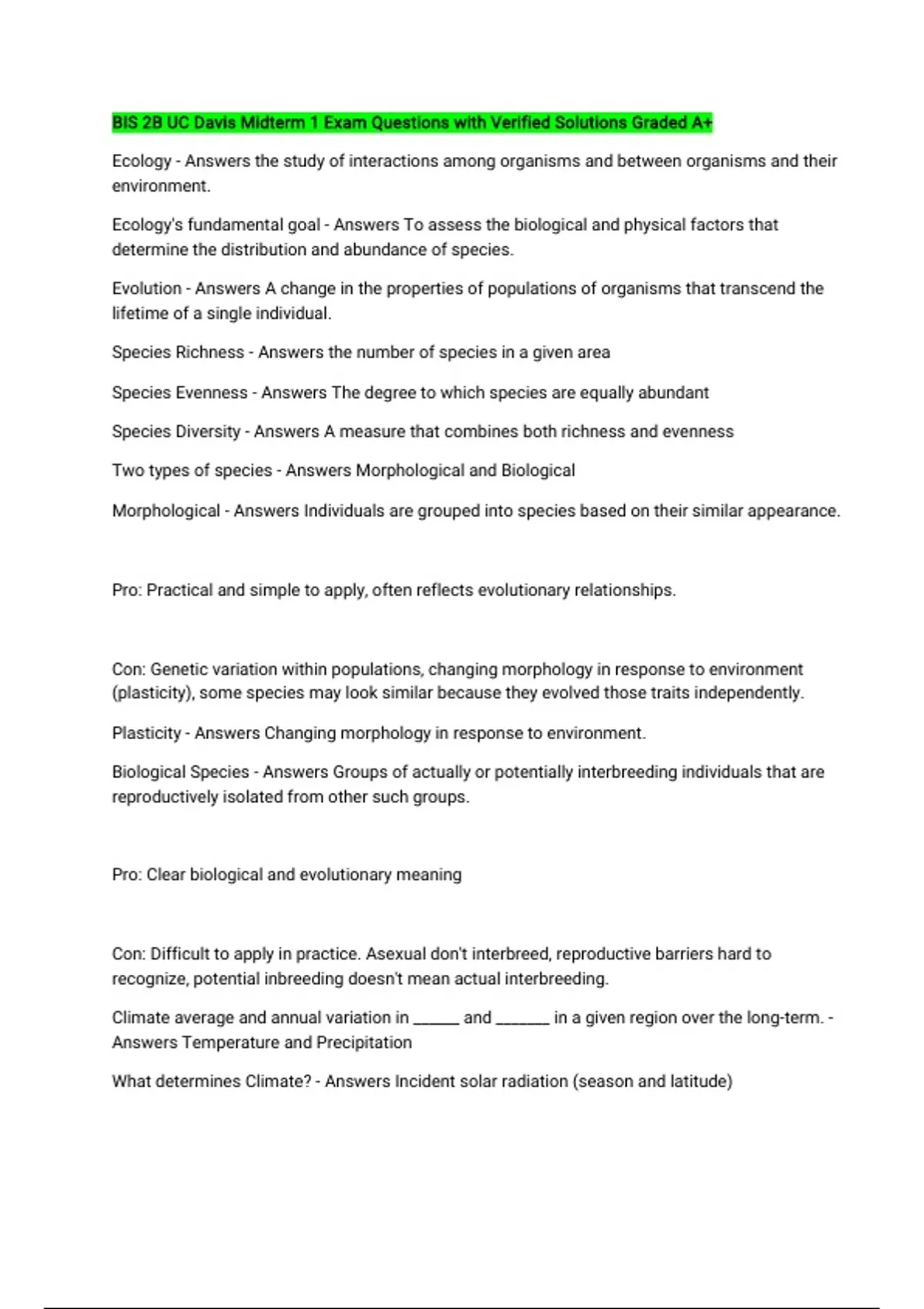 Species Diversity - Answers A measure that combines both richness and evenness