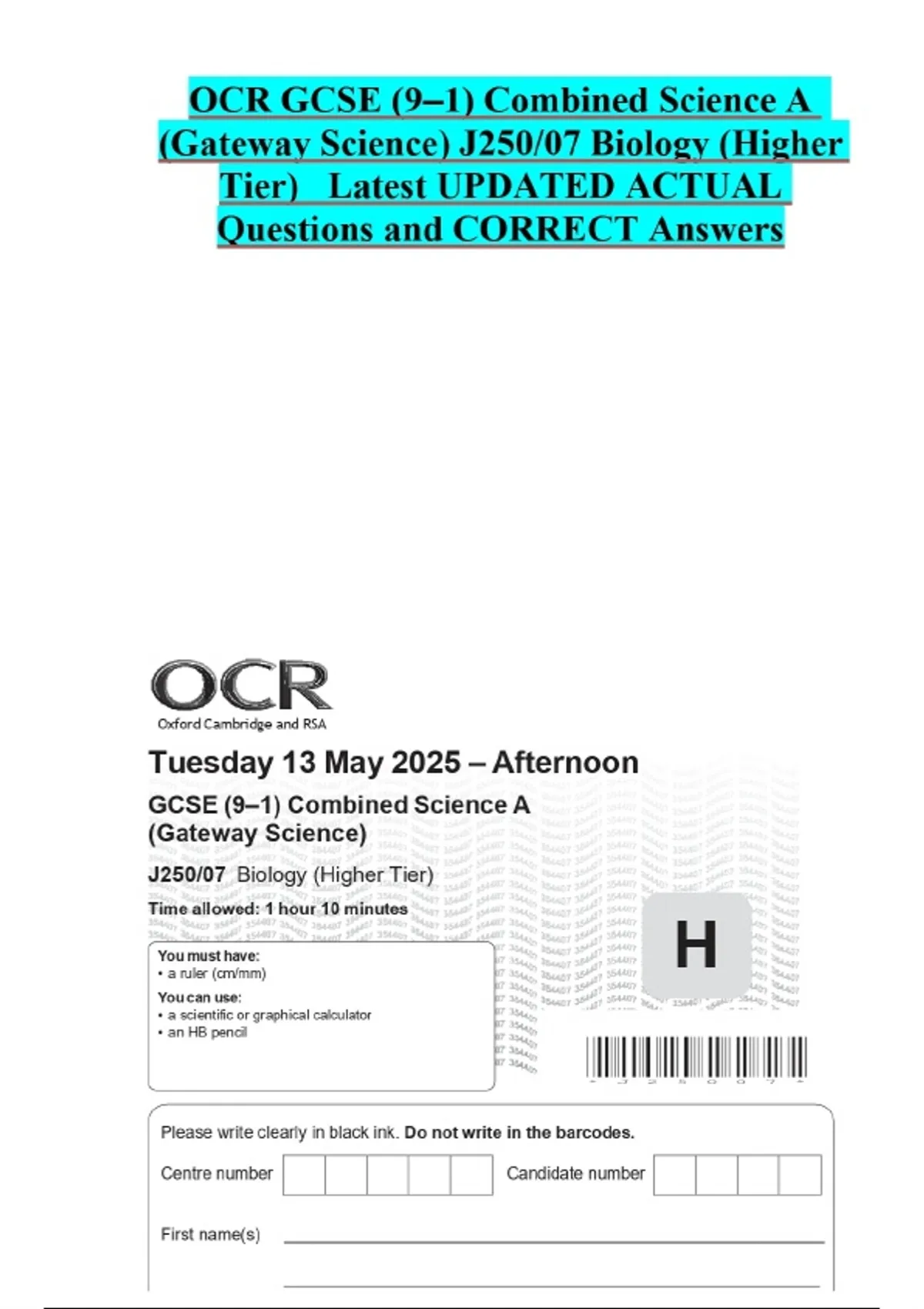 OCR GCSE (9–1) Combined Science A (Gateway Science) J250/07 Biology (Higher Tier) Latest UPDATED ACTUAL Questions and CORRECT Answers