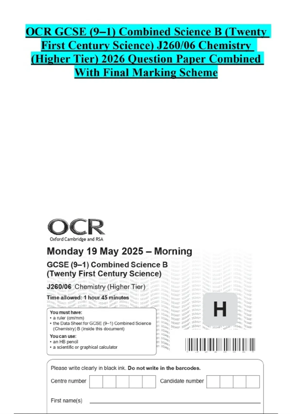 OCR GCSE (9–1) Combined Science B (Twenty First Century Science) J260/06 Chemistry (Higher Tier) 2026 Question Paper Combined With Final Marking Scheme