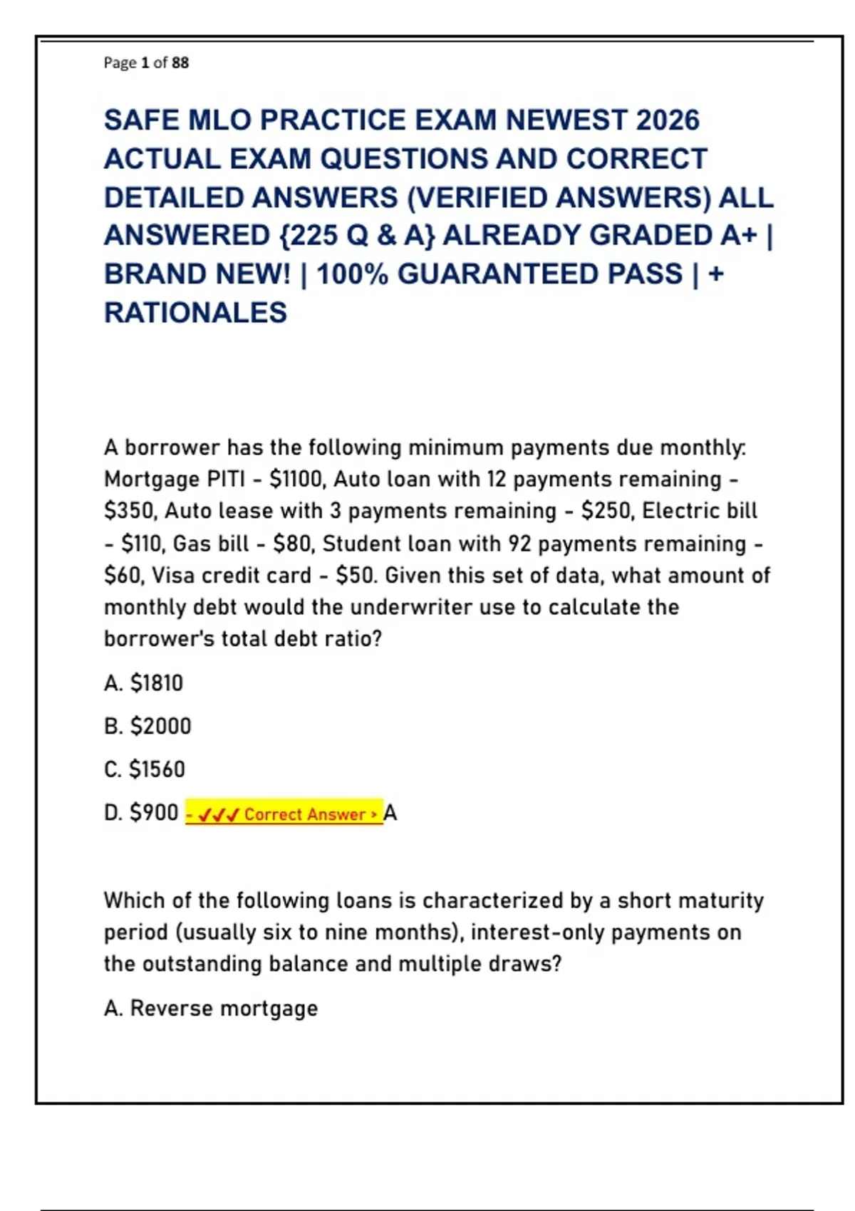 D. $900 - ✔✔✔ Correct Answer > A
