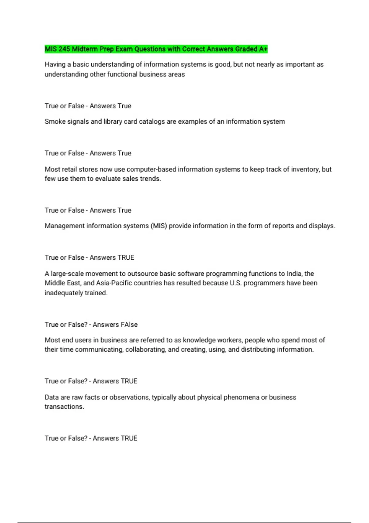 MIS 245 Midterm Prep Exam Questions with Correct Answers Graded A+ Having a basic understanding of information systems is good, but not nearly as important as understanding other functional business areas True or False - Answers True Smoke signals and library card catalogs are examples of an information system True or False - Answers True Most retail stores now use computer-based information systems to keep track of inventory, but few use them to evaluate sales trends. True or False - Answers True Management information systems (MIS) provide information in the form of reports and displays. True or False - Answers TRUE A large-scale movement to outsource basic software programming functions to India, the Middle East, and Asia-Pacific countries has resulted because U.S. programmers have been inadequately trained. True or False? - Answers FAlse Most end users in business are referred to as knowledge workers, people who spend most of their time communicating, collaborating, and creating, using, and distributing information. True or False? - Answers TRUE Data are raw facts or observations, typically about physical phenomena or business transactions. True or False? - Answers TRUE Information technology can be used to support _______________. Select one: a. customer support processes b. any other business activity c. product development teams d. All the choices are correct. - Answers D Companies generally rely on e-business applications to do all of the following except: Select one: a. Implement electronic commerce systems b. Promote enterprise collaboration among business teams and workgroups c. Monitor employee productivity d. Re-engineer internal business processes - Answers c Process control systems monitor and control _______________ processes. Select one: a. physical b. transactional c. inter-departmental d. mechanical - Answers physical The information systems function is equally as important to business success as the function of _______________. Select one: a. human resources management b. operations management c. accounting d. All the choices are correct. - Answers D An ___________ system is an organized combination of people, hardware, software, telecommunications networks, and data resources that collects, transforms, and disseminates information in an organization. - Answers Information The success of an information system should be measured by both its efficiency and its _________ - Answers accuracy _____________ is the information systems activity in which data and information are retained in an organized manner for later use. - Answers storage Most products and services have some sort of substitute available to the consumer. true or false? - Answers true A company that places a strategic focus on customer value recognizes that quality, rather than price, has become a primary determinant in a customer's perception of value. true or false? - Answers true The value chain concept can help managers decide where and how to apply the strategic capabilities of information technology. true or false? - Answers TRUE As an organization's learning process continues and its knowledge base expands, the knowledge creating company works to integrate its knowledge into its business processes, products, and services. true or false? - Answers TRUE All of the following are competitive forces in the marketplace except: Select one: a. Bargaining b. Alliances c. Growth d. Innovation - Answers Alliances When customers become dependent on mutually beneficial inter-enterprise information systems, they become reluctant to switch to a company's competitors because they would incur all following costs except: Select one: a. Effort b. Innovation