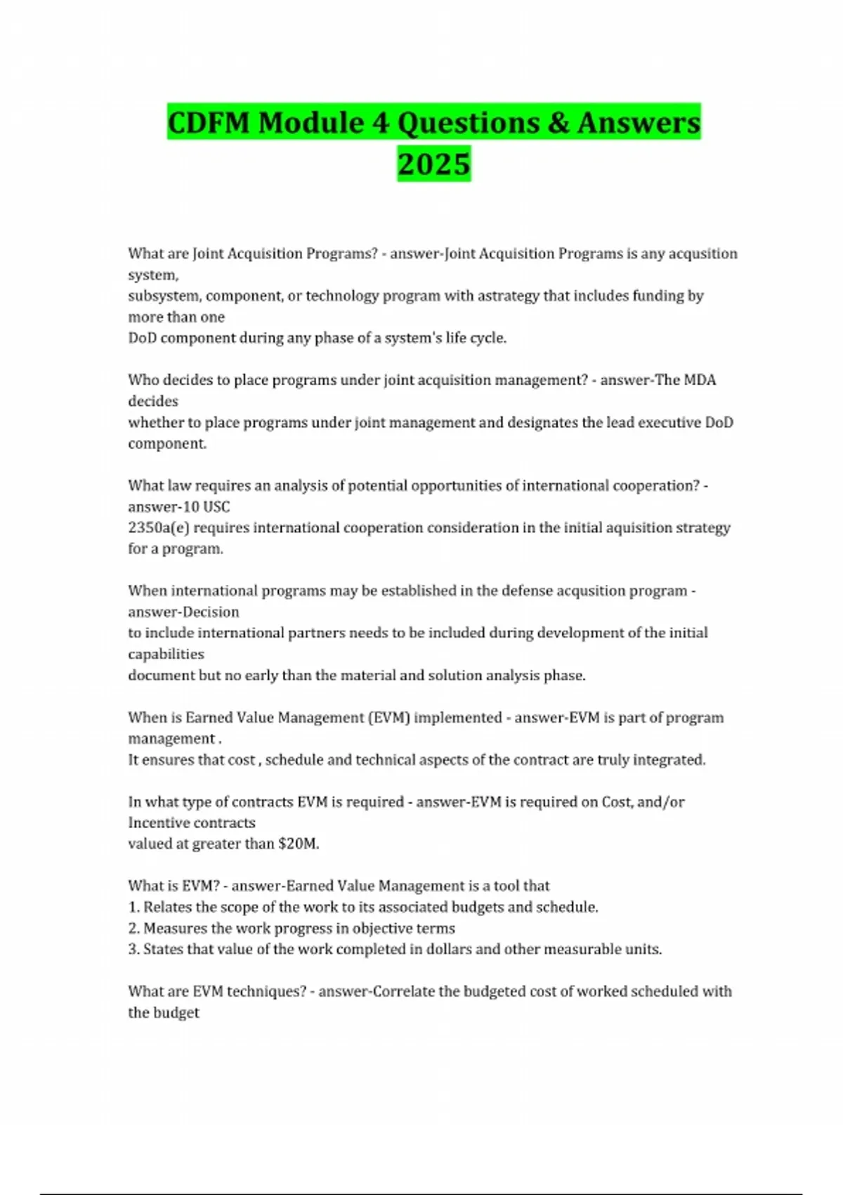 CDFM Module 4 Questions & Answers 2025 What are Joint Acquisition Programs? - answer-Joint Acquisition Programs is any acqusition system, subsystem, component, or technology program with astrategy that includes funding by more than one DoD component during any phase of a system's life cycle. Who decides to place programs under joint acquisition management? - answer-The MDA decides whether to place programs under joint management and designates the lead executive DoD component. What law requires an analysis of potential opportunities of international cooperation? - answer-10 USC 2350a(e) requires international cooperation consideration in the initial aquisition strategy for a program. When international programs may be established in the defense acqusition program - answer-Decision to include international partners needs to be included during development of the initial capabilities document but no early than the material and solution analysis phase. When is Earned Value Management (EVM) implemented - answer-EVM is part of program management . It ensures that cost , schedule and technical aspects of the contract are truly integrated. In what type of contracts EVM is required - answer-EVM is required on Cost, and/or Incentive contracts valued at greater than $20M. What is EVM? - answer-Earned Value Management is a tool that 1. Relates the scope of the work to its associated budgets and schedule. 2. Measures the work progress in objective terms 3. States that value of the work completed in dollars and other measurable units. What are EVM techniques? - answer-Correlate the budgeted cost of worked scheduled
