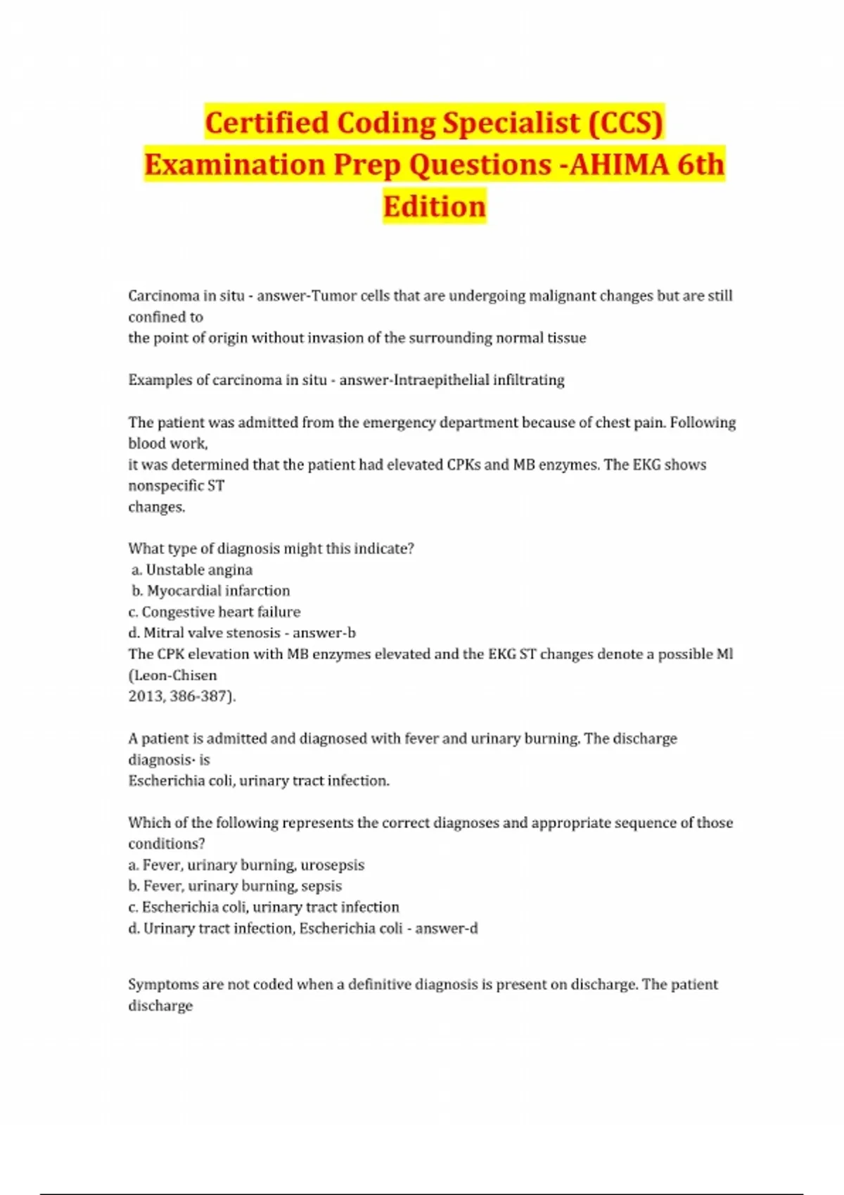 Certified Coding Specialist (CCS) Examination Prep Questions -AHIMA 6th Edition Carcinoma in situ - answer-Tumor cells that are undergoing malignant changes but are still confined to the point of origin without invasion of the surrounding normal tissue Examples of carcinoma in situ - answer-Intraepithelial infiltrating The patient was admitted from the emergency department because of chest pain. Following blood work, it was determined that the patient had elevated CPKs and MB enzymes. The EKG shows nonspecific ST changes. What type of diagnosis might this indicate? a. Unstable angina b. Myocardial infarction c. Congestive heart failure d. Mitral valve stenosis - answer-b The CPK elevation with MB enzymes elevated and the EKG ST changes denote a possible Ml (Leon-Chisen 2013, 386-387). A patient is admitted and diagnosed with fever and urinary burning. The discharge diagnosis· is Escherichia coli, urinary tract infection. Which of the following represents the correct diagnoses and appropriate sequence of those conditions? a. Fever, urinary burning, urosepsis b. Fever, urinary burning, sepsis c. Escherichia coli, urinary tract infection d. Urinary tract infection, Escherichia coli - answer-d