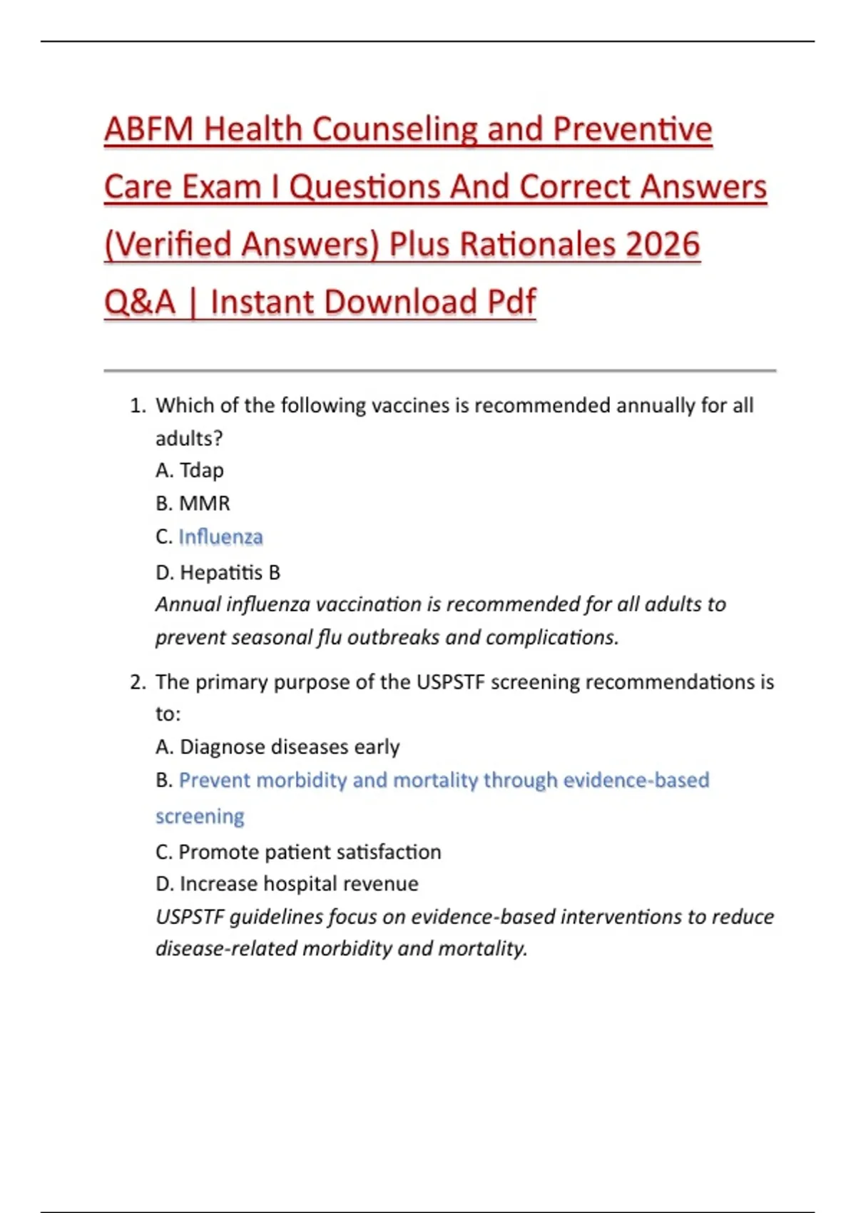 ABFM Health Counseling and Preventive Care Exam I Questions And Correct Answers (Verified Answers) Plus Rationales 2026 Q&A | Instant Download Pdf