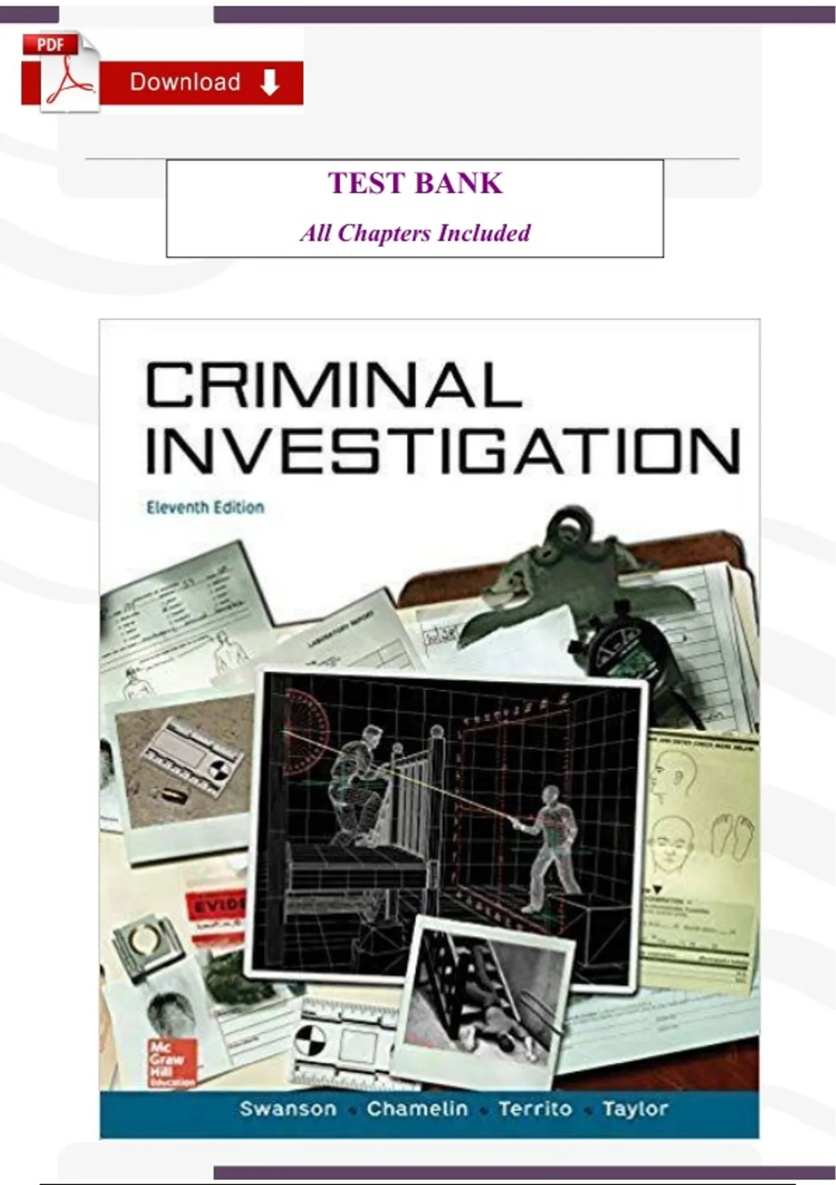 The Criminal Investigation (13th Edition) – Verified Test Bank by Swanson is a comprehensive exam preparation resource designed for criminal justice students, educators, and law enforcement trainees. This test bank is carefully aligned with the 13th Edition of Criminal Investigation by Swanson, ensuring accuracy, relevance, and reliability. It provides a wide range of exam‑style questions, detailed rationales, and structured answers that mirror the complexity of college‑level criminal justice assessments and professional training exams. Criminal investigation is a cornerstone of law enforcement and criminal justice education. Students must master investigative techniques, evidence collection, crime scene management, interviewing and interrogation, report writing, and courtroom testimony. Without structured practice, it can be overwhelming to retain and apply this knowledge in real‑world scenarios. This verified test bank simplifies the learning process by offering exam‑focused questions that reinforce critical thinking, legal reasoning, and practical application. Each question is designed to reflect the textbook’s content, helping learners build confidence and competence in criminal investigation. Key Features Complete coverage of all chapters in the 13th Edition textbook Multiple‑choice, case‑based, and application questions for diverse practice Detailed rationales explaining correct and incorrect answers Exam‑ready format that prepares students for criminal justice exams and law enforcement training assessments Time‑saving structure for efficient revision and targeted study Benefits for Students This test bank is an invaluable tool for criminal justice students who want to excel in their coursework and exams. It helps learners: Strengthen understanding of investigative techniques and evidence collection Practice exam strategies with realistic, high‑yield questions Build confidence in applying theoretical knowledge to criminal cases Save study time by focusing on essential, exam‑relevant content Improve performance in criminal justice courses and certification exams Benefits for Educators Criminal justice faculty can use this resource to: Create quizzes, assignments, and exams quickly Assess student comprehension effectively Provide structured feedback with rationales Ensure alignment with the Criminal Investigation, 13th Edition textbook Who Should Use This Resource Criminal justice students preparing for exams and certifications Educators designing course assessments and evaluations Law enforcement trainees refreshing investigative knowledge Anyone seeking a reliable, exam‑focused study tool Why Choose This Verified Test Bank Trusted by criminal justice programs worldwide, this verified test bank is carefully crafted to match the textbook content, ensuring accuracy and relevance. By practicing with these questions, learners not only memorize theoretical concepts but also develop the ability to apply them in real‑world investigative contexts. With this resource, you can reduce stress, save time, and achieve better results in your criminal investigation exams.