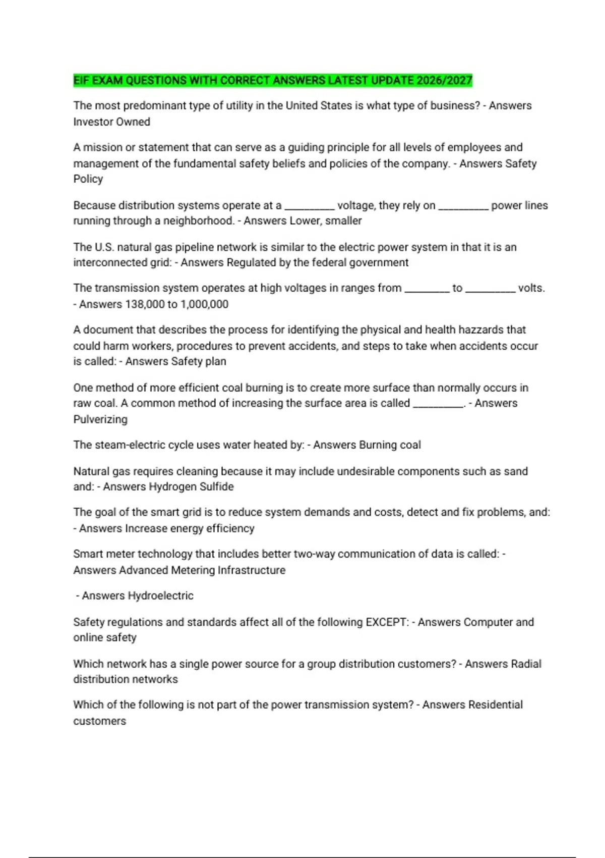 EIF EXAM QUESTIONS WITH CORRECT ANSWERS LATEST UPDATE 2026/2027 The most predominant type of utility in the United States is what type of business? - Answers Investor Owned A mission or statement that can serve as a guiding principle for all levels of employees and management of the fundamental safety beliefs and policies of the company. - Answers Safety Policy Because distribution systems operate at a __________ voltage, they rely on __________ power lines running through a neighborhood. - Answers Lower, smaller The U.S. natural gas pipeline network is similar to the electric power system in that it is an interconnected grid: - Answers Regulated by the federal government The transmission system operates at high voltages in ranges from _________ to __________ volts. - Answers 138,000 to 1,000,000 A document that describes the process for identifying the physical and health hazzards that could harm workers, procedures to prevent accidents, and steps to take when accidents occur is called: - Answers Safety plan One method of more efficient coal burning is to create more surface than normally occurs in raw coal. A common method of increasing the surface area is called __________. - Answers Pulverizing The steam-electric cycle uses water heated by: - Answers Burning coal Natural gas requires cleaning because it may include undesirable components such as sand and: - Answers Hydrogen Sulfide The goal of the smart grid is to reduce system demands and costs, detect and fix problems, and: - Answers Increase energy efficiency Smart meter technology that includes better two-way communication of data is called: - Answers Advanced Metering Infrastructure - Answers Hydroelectric Safety regulations and standards affect all of the following EXCEPT: - Answers Computer and online safety Which network has a single power source for a group distribution customers? - Answers Radial distribution networks Which of the following is not part of the power transmission system? - Answers Residential customers After cleaning and processing, gas next moves through pipelines to a gas storage field or a __________. - Answers Compressor station How well coal will withstand transportation, handling, and storage and how well it will burn depends on the amounts of __________ in it. - Answers Carbon A __________ is an electrical device by which alternating current of one voltage is changed to another voltage. - Answers Transformer