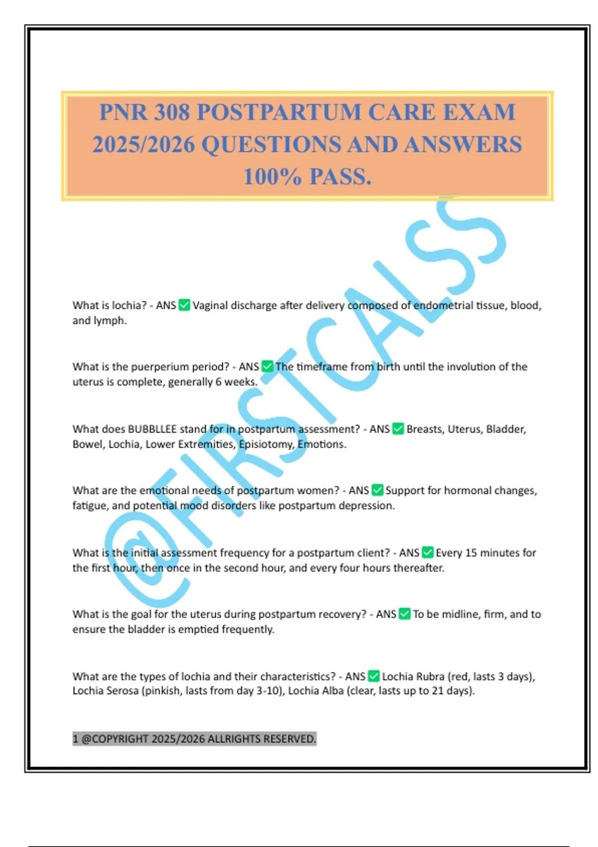 PNR 308 POSTPARTUM CARE EXAM 2025/2026 QUESTIONS AND ANSWERS 100% PASS.