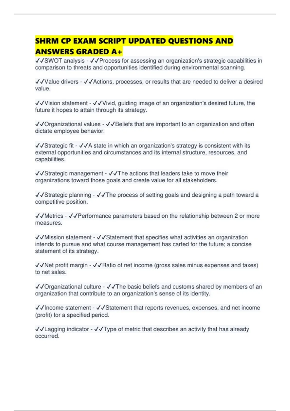 SHRM CP EXAM SCRIPT UPDATED QUESTIONS AND ANSWERS GRADED A+