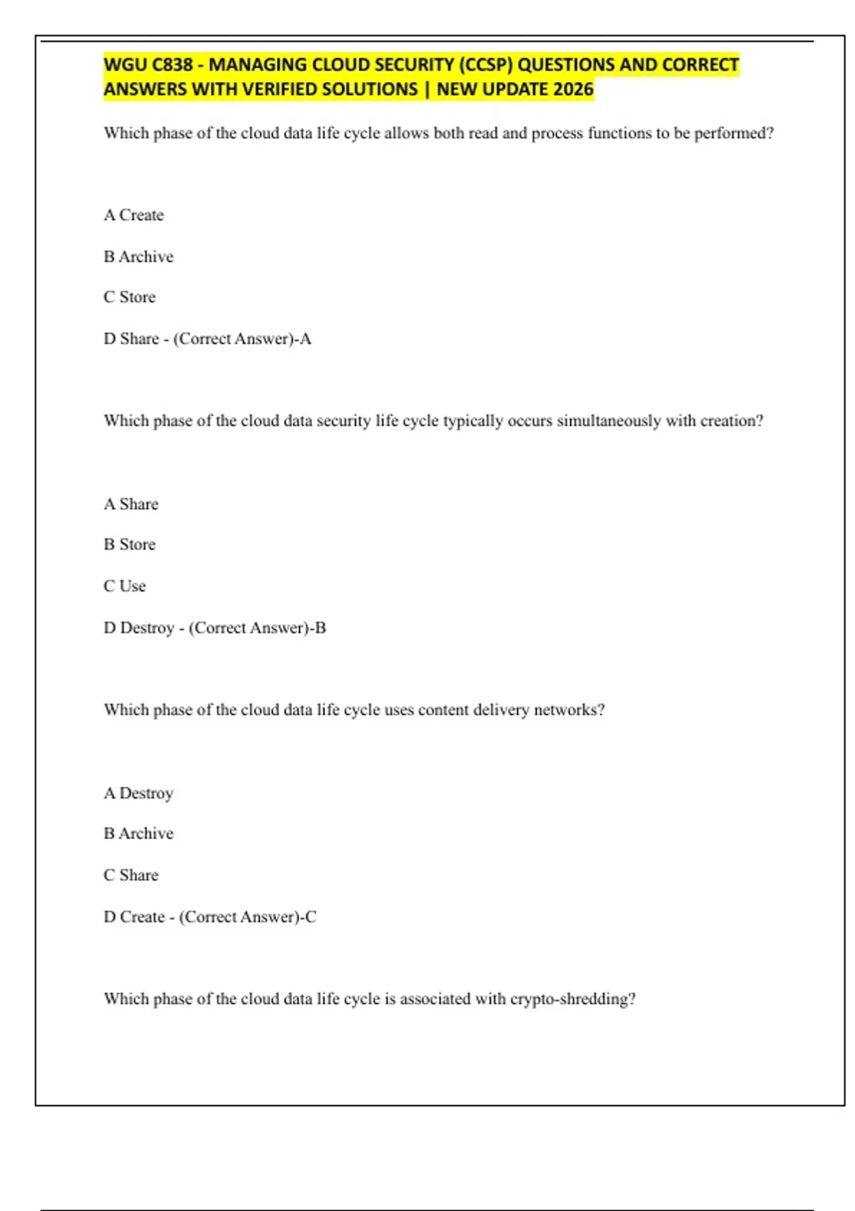 WGU C838 - Managing Cloud Security (CCSP) Questions and Correct Answers with Verified Solutions | New Update 2026