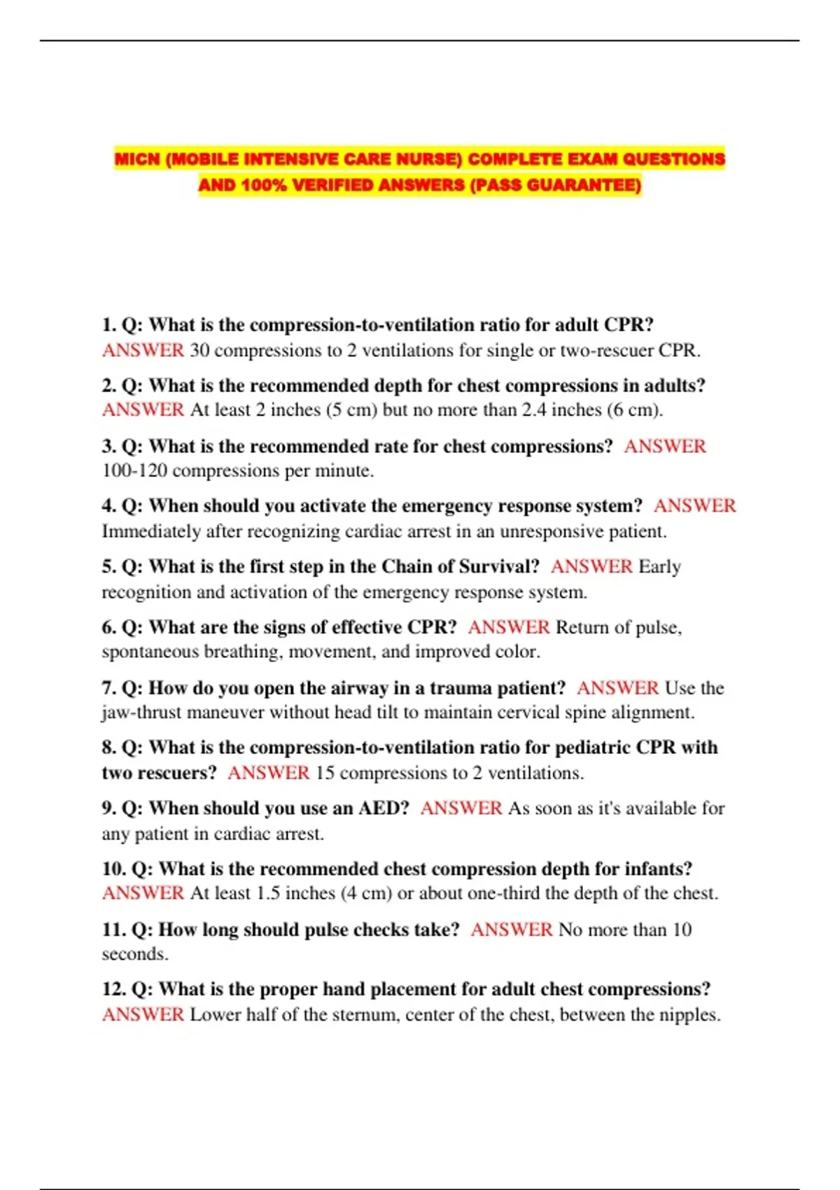 MICN (MOBILE INTENSIVE CARE NURSE) COMPLETE EXAM QUESTIONS AND 100% VERIFIED ANSWERS (PASS GUARANTEE)