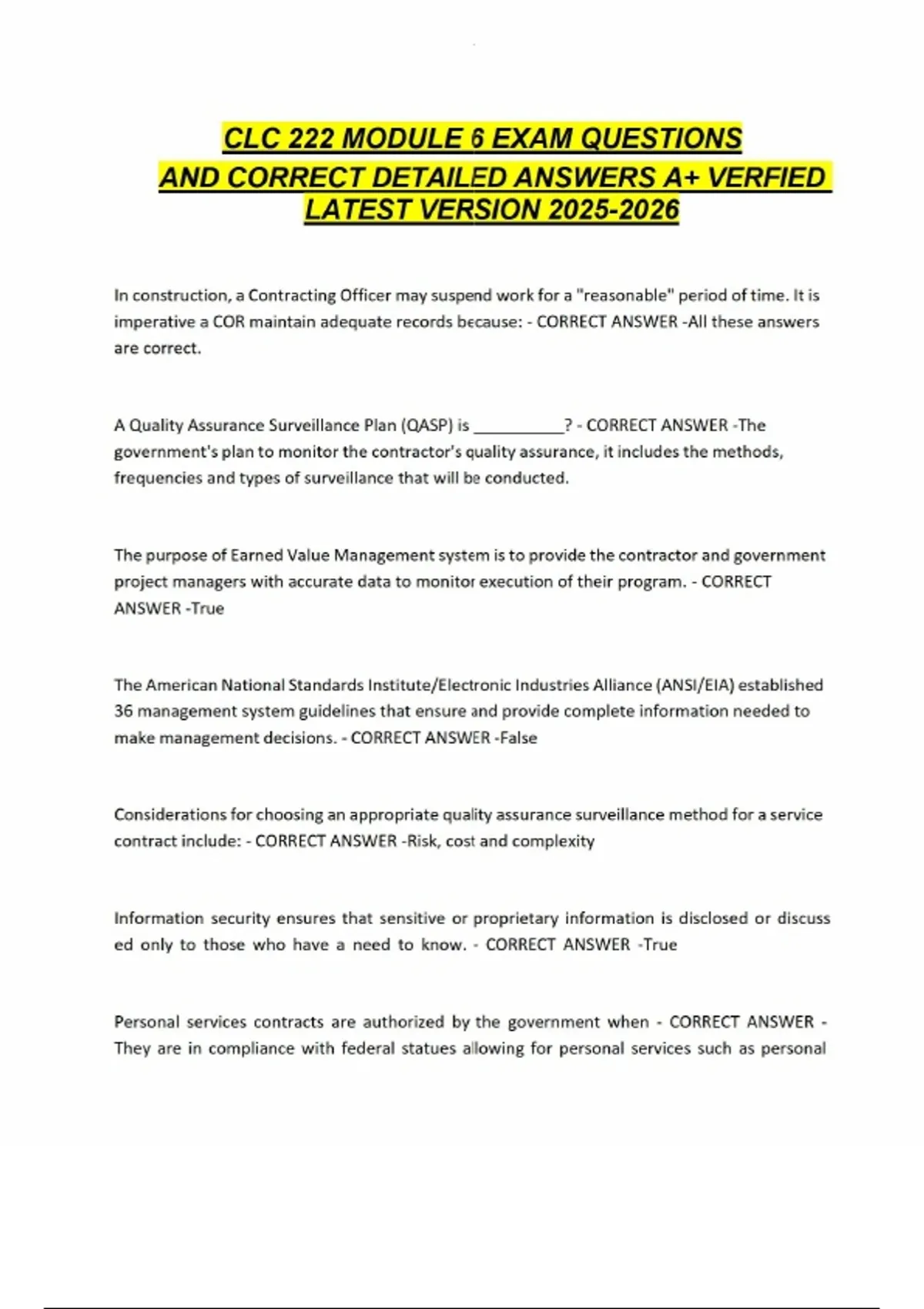 CLC 222 MODULE 6 EXAM QUESTIONS AND CORRECT DETAILED ANSWERS A+ VERFIED LATEST VERSION CLC 222 MODULE 6 EXAM QUESTIONS AND CORRECT DETAILED ANSWERS A+ VERFIED LATEST VERSION CLC 222 MODULE 6 EXAM QUESTIONS AND CORRECT DETAILED ANSWERS A+ VERFIED LATEST VERSION