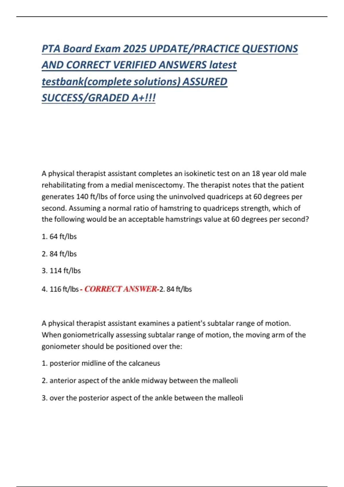 4. 116 ft/lbs - CORRECT ANSWER-2. 84 ft/lbs