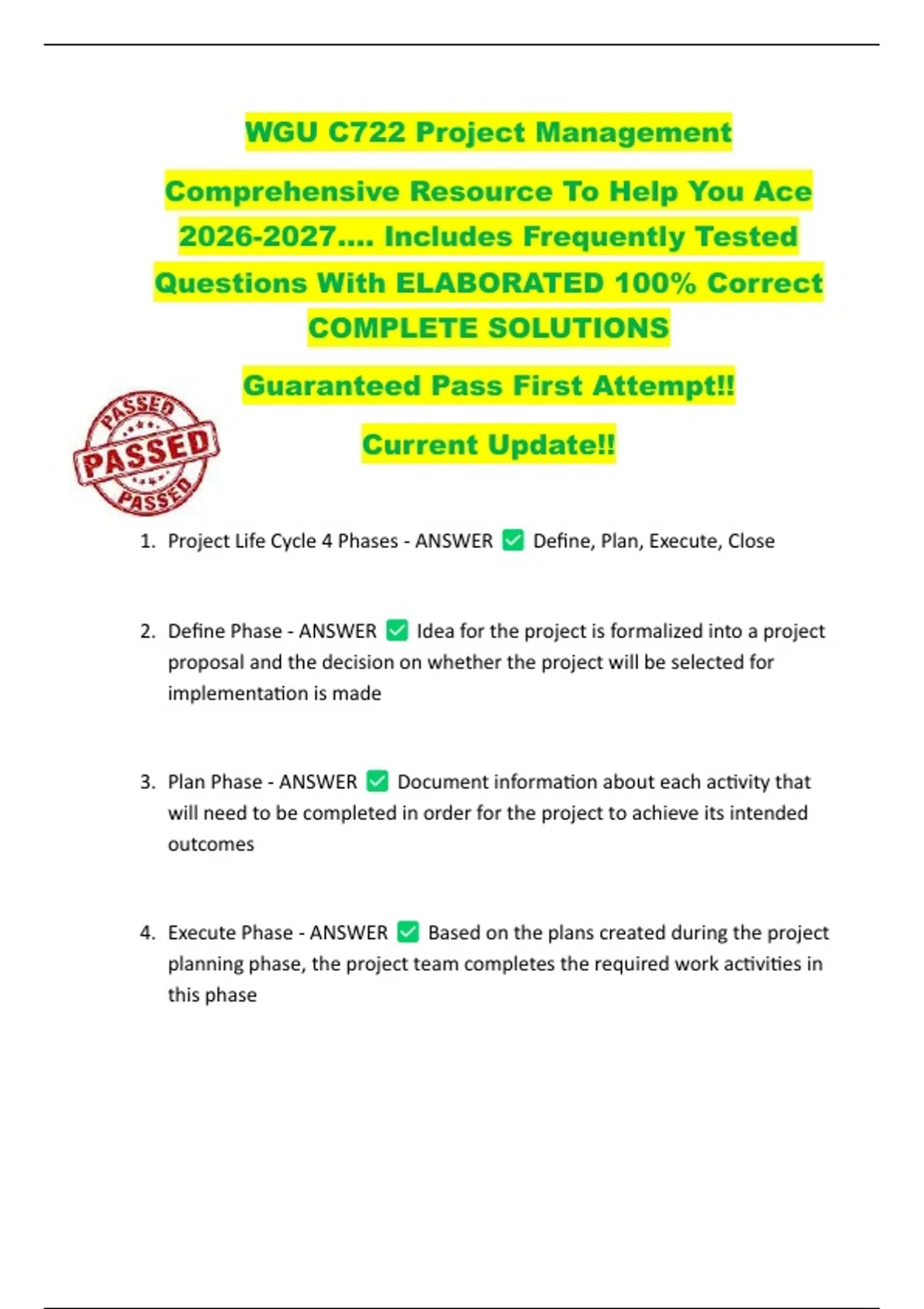 WGU C722 Project Management Comprehensive Resource To Help You Ace .… Includes Frequently Tested Questions With ELABORATED 100% Correct COMPLETE SOLUTIONS Guaranteed Pass First Attempt!! Current Update!! 1. Project Life Cycle 4 Phases - ANSWER Define, Plan, Execute, Close 2. Define Phase - ANSWER Idea for the project is formalized into a project proposal and the decision on whether the project will be selected for implementation is made 3. Plan Phase - ANSWER Document information about each activity that will need to be completed in order for the project to achieve its intended outcomes 4. Execute Phase - ANSWER Based on the plans created during the project planning phase, the project team completes the required work activities in this phase 5. Closing Phase - ANSWER Project outcomes are delivered to the customer and/or sponsor and the customer and/or sponsor evaluates them to determine if they are acceptable - deliverables are ready, the budget and time requirements are met and quality is achieved, and lessons learned are documented 6. PM Methods - ANSWER PERT, CPM, critical chain, waterfall, and PRINCE2 7. PERT (Project evaluation and review technique) - ANSWER Developed in 1950 to estimate activity on Navy's Polaris missile project. 8. CPM (Critical path method) - ANSWER Developed by DuPont to help with project in manufacturing. Similar to PERT but assumes that estimates do not vary and time can be reliably estimated 9. Critical chain project management (CCPM) - ANSWER Work each resource is expected to complete is checked to verify that the resource will be capable and available when needed. Time buffers are built into the schedule to handle situations when the critical resources fall behind or aren't available 10. Waterfall - ANSWER This process flows logically and in a linear fashion, but if any problems are found, returning the work back to the previous step is very expensive