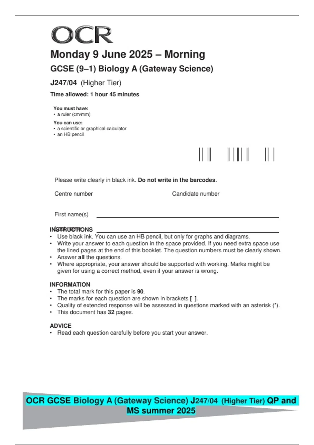 OCR GCSE Biology A (Gateway Science) J247/04 (Higher Tier) QP and