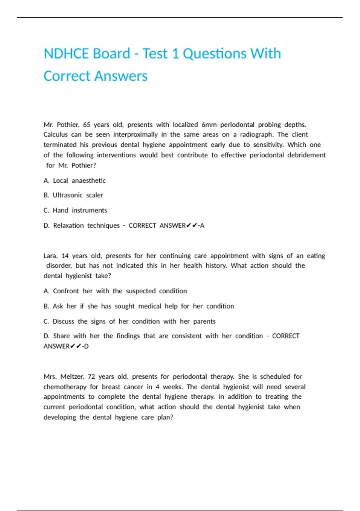 NDHCE Board - Test 1 Questions With Correct Answers